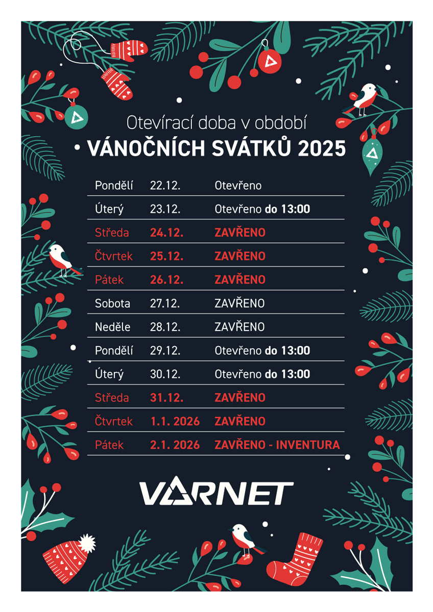 Zároveň vás informujeme o změně otevírací doby během vánočních svátků a v první dny nového roku na všech našich pobočkách. Také upozorňujeme, že z provozních důvodů nebude možné od 16. 12. 2025 do 6. 1. 2026 využít výdejní místa na pobočkách ELKOV elektro pro vyzvednutí vašich objednávek. Ostatní nabízené způsoby dopravy budou nadále k dispozici. Děkujeme za pochopení.