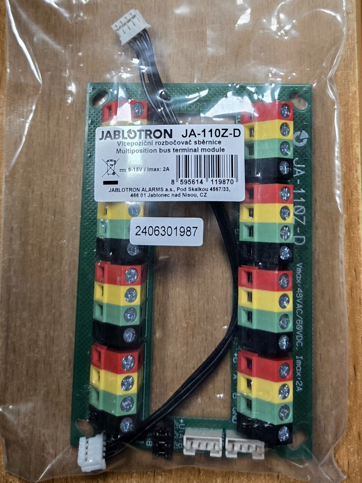 Je určen ke spojování vodičů u rozsáhlejších sběrnicových instalací systému JABLOTRON 100+. Rozpojením jumper propojek jej lze rozdělit na dvě nezávislé větve sběrnice. Součástí balení je propojovací kabel k ústřeně JA-107K (konektor I-BUS).
