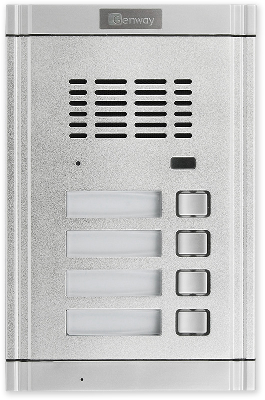 Venkovní dveřní audiojednotka s čtyřmi vyzváněcími tlačítky. Jednotka je určena pro zápustnou montáž a BOX na zapuštění je součástí dodávky. Výstup pro zámek je určený pro zámky s momentovým kolíkem.