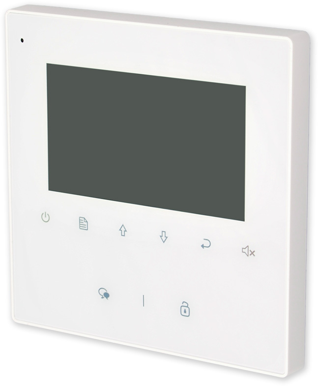 Vnitřní zobrazovací jednotka pro videotelefony řady V-LINE s barevným LCD 4,3" displejem, reproduktorem a mikrofonem. Je určena pro povrchovou montáž. Rozlišení 32 adres v systému a možnost připojení tlačítka zvonku od bytových dveří.