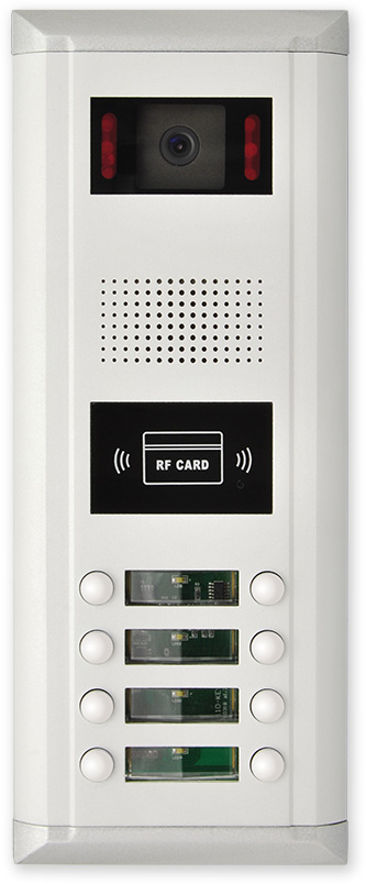 Venkovní jednotka s kamerou pro více účastníků řady V-LINE s 8 tlačítky a čtečkou, reproduktorem a mikrofonem. Je určena pro zápustnou nebo povrchovou montáž.