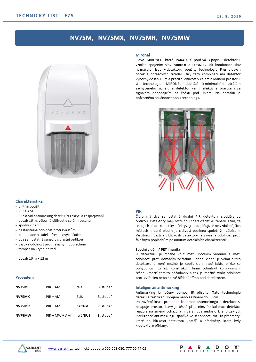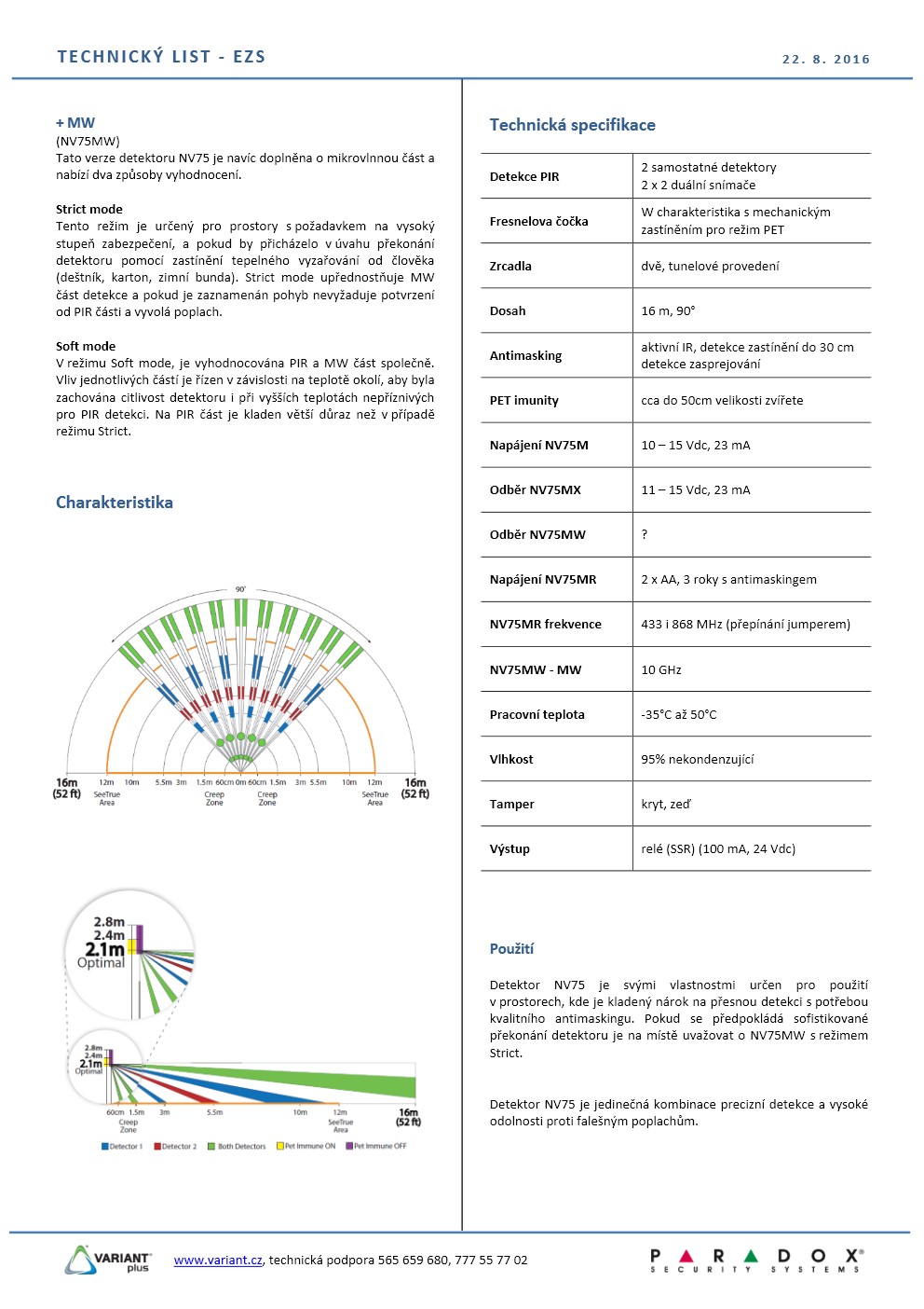 Duální infrapasivní detektor s plně digitálním zpracováním signálu, aktivním IR antimaskingem, dosahem 16 m/90°, PET imunitou, spodním viděním, tamper sejmutí ze zdi, citlivost nastavitelná v 5-ti úrovních, digitální automatický čítač pulsů, teplotní kompenzace, vysoká odolnost proti RF rušení.