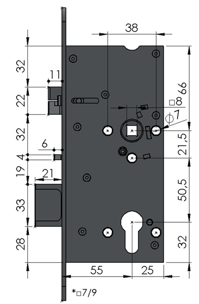vzdálenost kliky od čela zámku (včetně lišty) 55 mm