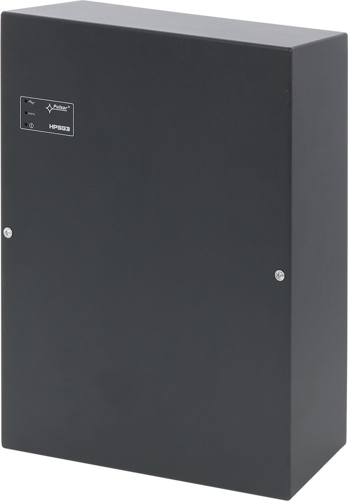Pomocný spínaný zdroj v plechovém boxu s LED signalizací, určený pro instalace do poplachových systémů se stupněm zabezpečení 2 a 3. LED zobrazují aktuální stav pomocného zdroje. Zdroj je v provedení AC/DC měniče, který se vyznačuje vysokou provozní odolností, vysokou účinností a minimálním ohřevem. Modul vyhodnocuje poruchu AC, AUX a akumulátoru a tyto stavy jsou signalizovány pomocí výstupních relé. Pro splnění bezpečnostní kategorie je potřeba vznik poruchy přenášet do systému. Výstupní proud AUX a dobíjecí proud akumulátoru je potřeba volit tak, aby byla splněna příslušná bezpečnostní norma z hlediska doby zálohování a doby dobíjení akumulátoru.