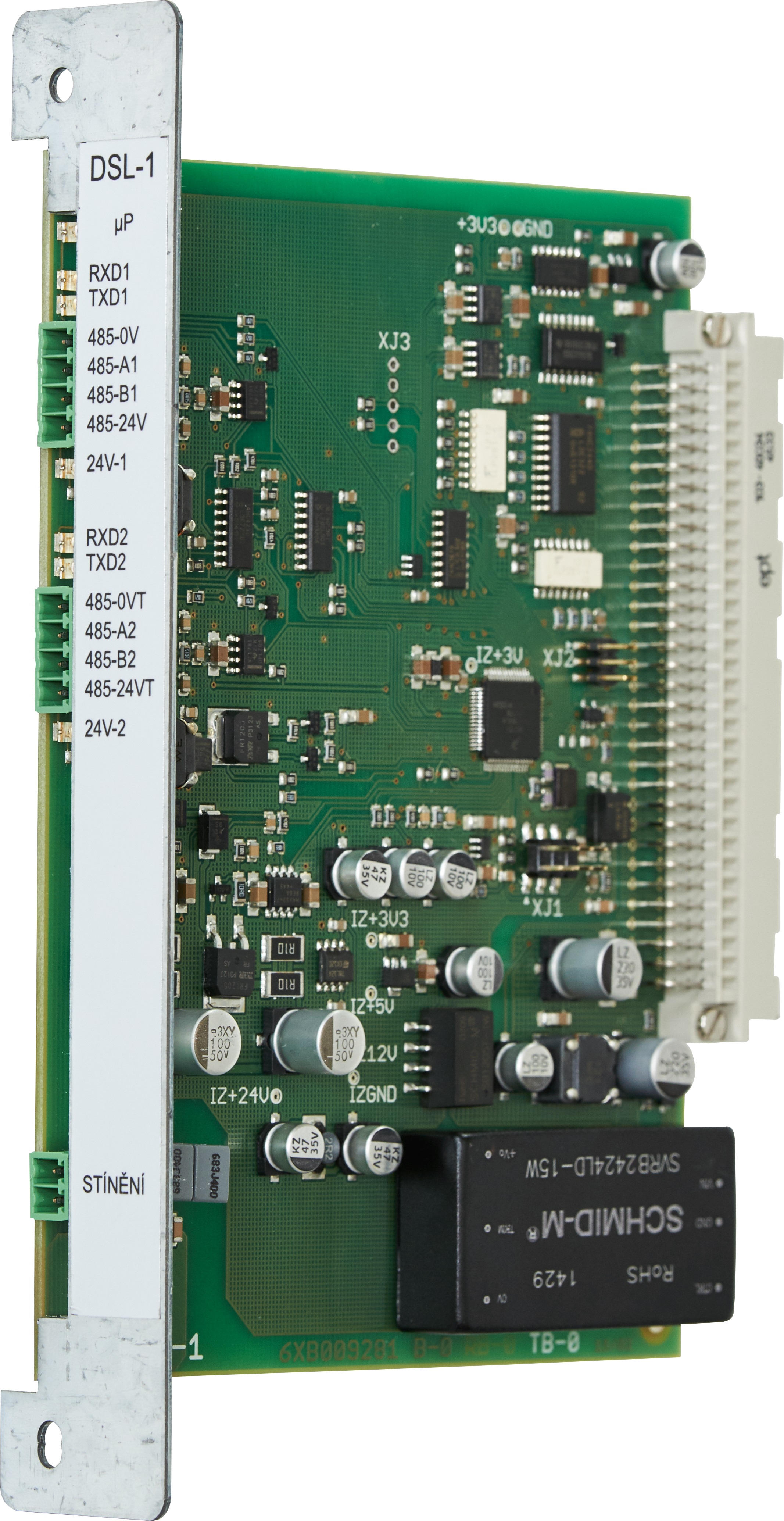 umožňuje zapojit kruhovou nebo jednoduchou komunikační SLAVE linku, LED diody pro optické signalizace stavů sběrnic a komunikace s DSY, protokol RS-485 slouží k připojení až 16-ti přídavných zařízení ústředny, umožňuje připojit OPPO - panely požární ochrany MHY-919, dále jednotky výstupů MHY-918 a V/V prvky MHY-925-4 / MHY-925-8 POZOR! SLAVE sběrnice neumožňuje připojení tabla MHS-817