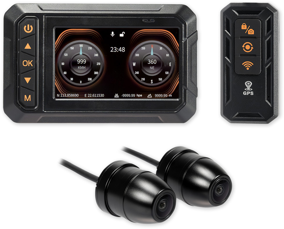 K ještě většímu komfortu při používání slouží dálkový ovladač na kabelu, který je součástí balení. Tento ovladač je vybaven GPS modulem pro záznam polohy a také LED indikátorem, jenž přehledně informuje o stavu zařízení. Ovládání je navíc zjednodušeno o možnost pořídit fotografii a uzamčení souboru. Stačí stisknout tlačítko. Lze tak v okamžiku zachytit důležité momenty, aniž by bylo nutné zastavovat nebo manipulovat s kamerou. Další klíčovou vlastností je voděodolnost obou kamer, což je nezbytné při jejich používání na motocyklu, kde jsou zařízení často vystavena náročným povětrnostním podmínkám. Voděodolné provedení zajišťuje jejich spolehlivý provoz a dlouhodobou životnost.