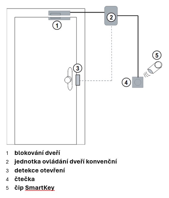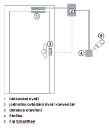 Konvenční modul pro ovládání dveří v závislosti na stavu systému. Modul ovládá dveřní zámek, vyhodnocuje otevření / zavření dveří pomocí magnetického kontaktu a vše je logicky provázané se stavem systému arm / disarm. V případě, že prostor za dveřmi je ve střežení systém neumožní průchod. K modulu je připojená čtečka, která umožňujě hlídání vypnout a průchod umožnit.