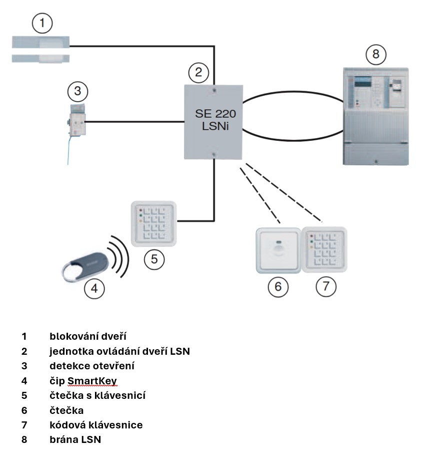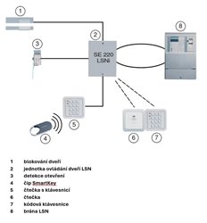 Modul pro ovládání dveří v závislosti na hlídání systému. Pokud je systém ve střežení není umožňen vstup.Zastřežení / odstřežení lze ovládat přes čtečku, čtečku s klávesnicí, kódovou klávesnici.