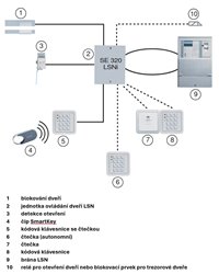 Modul pro ovládání dveří v závislosti na hlídání systému. Pokud je systém ve střežení není umožňen vstup. Zastřežení / odstřežení lze ovládat přes čtečku, čtečku s klávesnicí, kódovou klávesnici. Modul má i výstup pro blokování trezorových dveří.