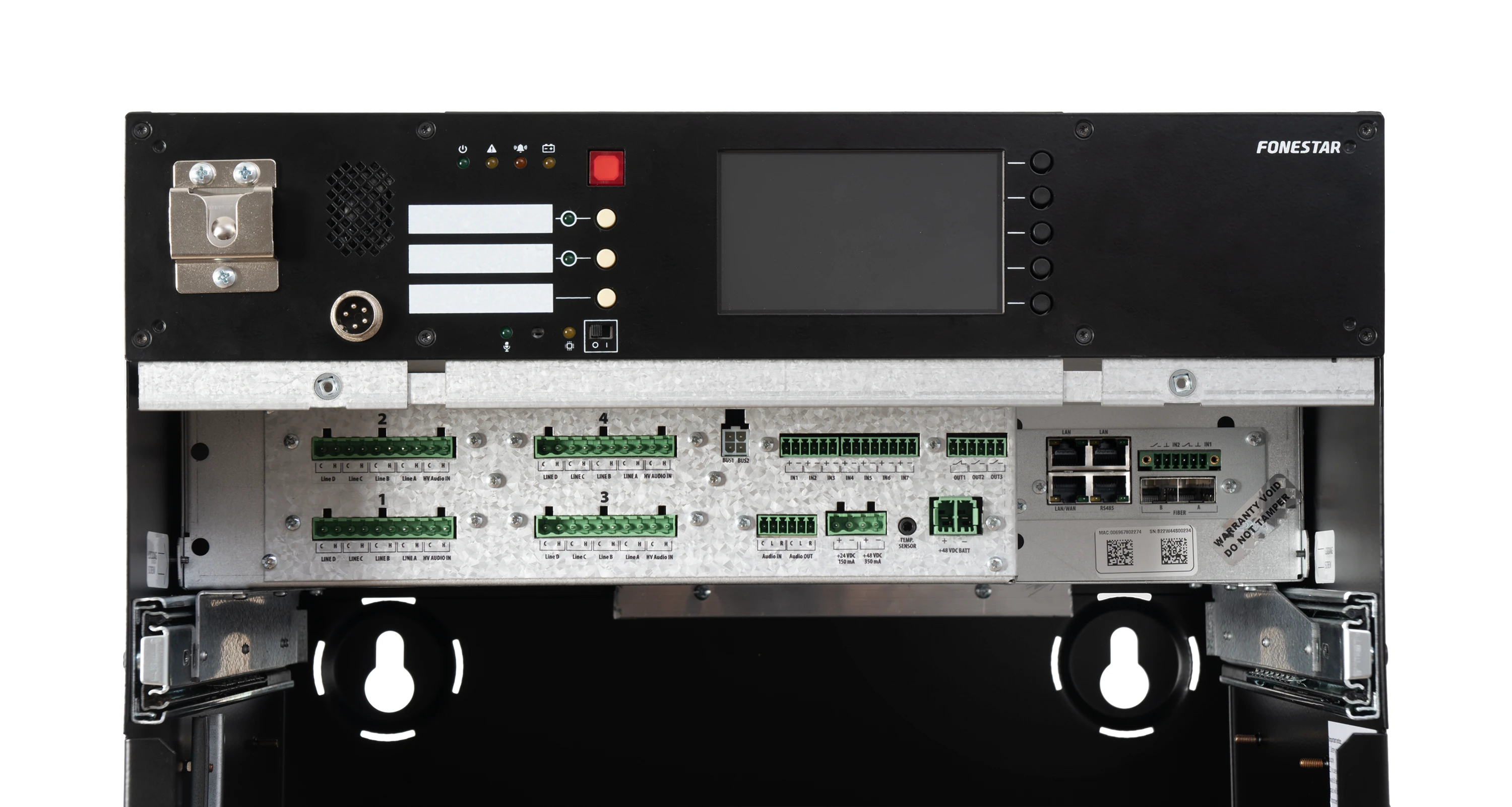 • Vestavěný hasičský mikrofon, dotykový displej, DSP, tlačítka a programovatelné GPI/O vstupy a výstupy