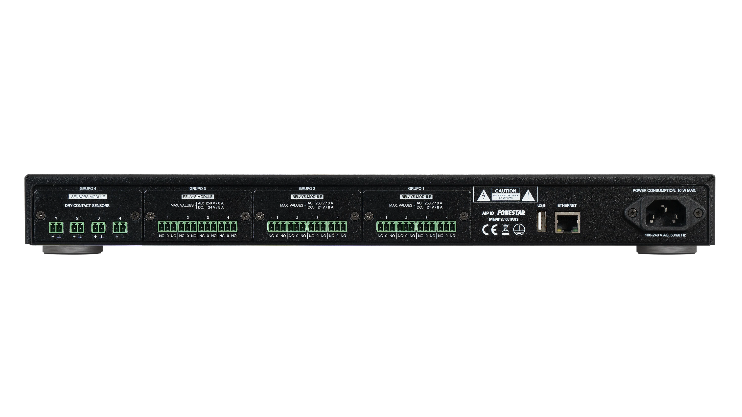 Fonestar AIP-IO-4S12R je univerzální I/O zařízení pro IP audio systém AIP s 4 programovatelnými izolovanými vstupy a 12 výstupními relé. Nabízí široké možnosti aktivace událostí a ovládání externích zařízení, ideální pro komplexní profesionální instalace.