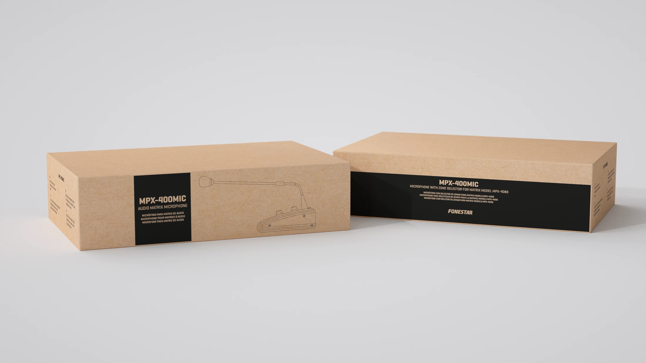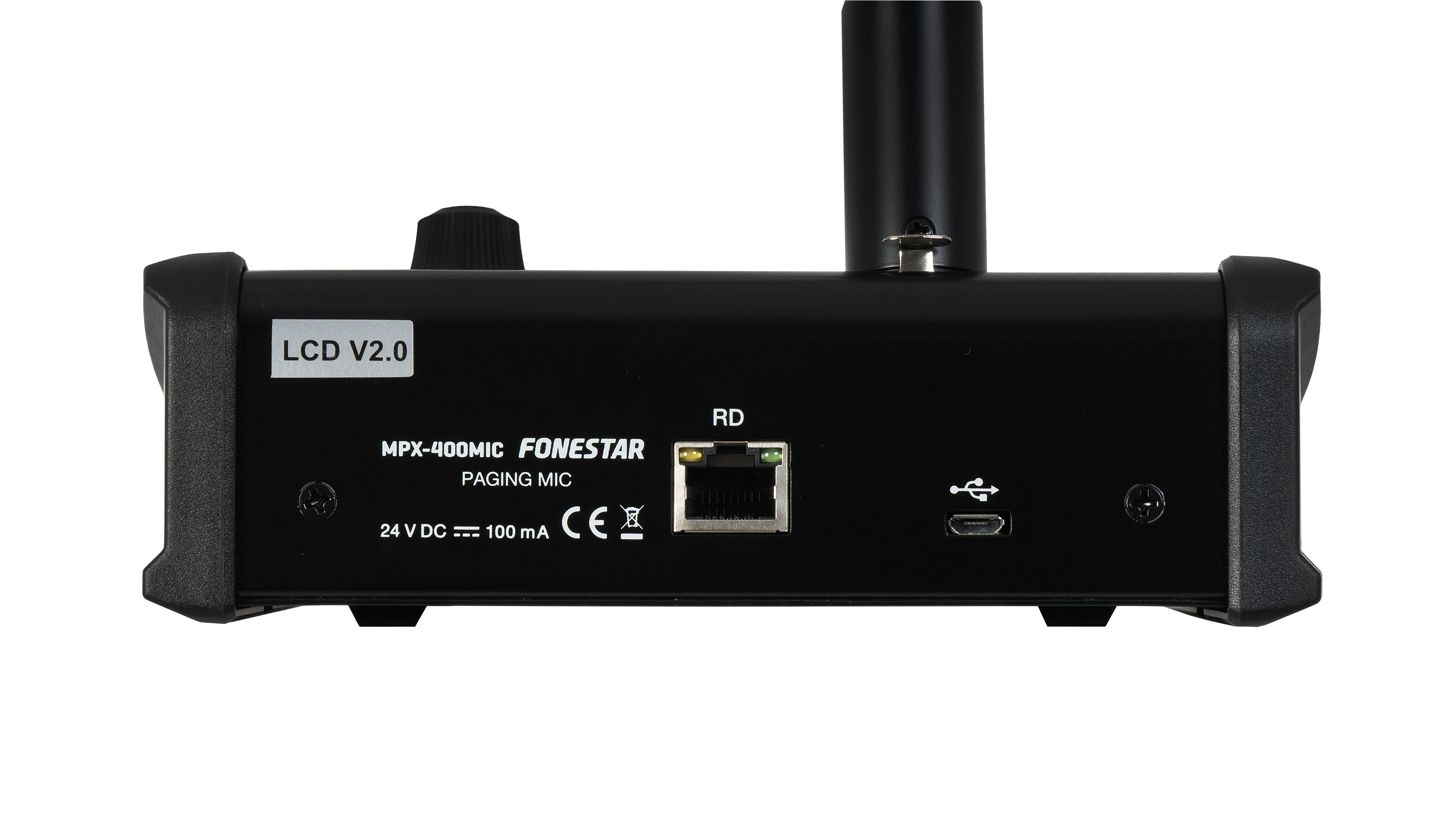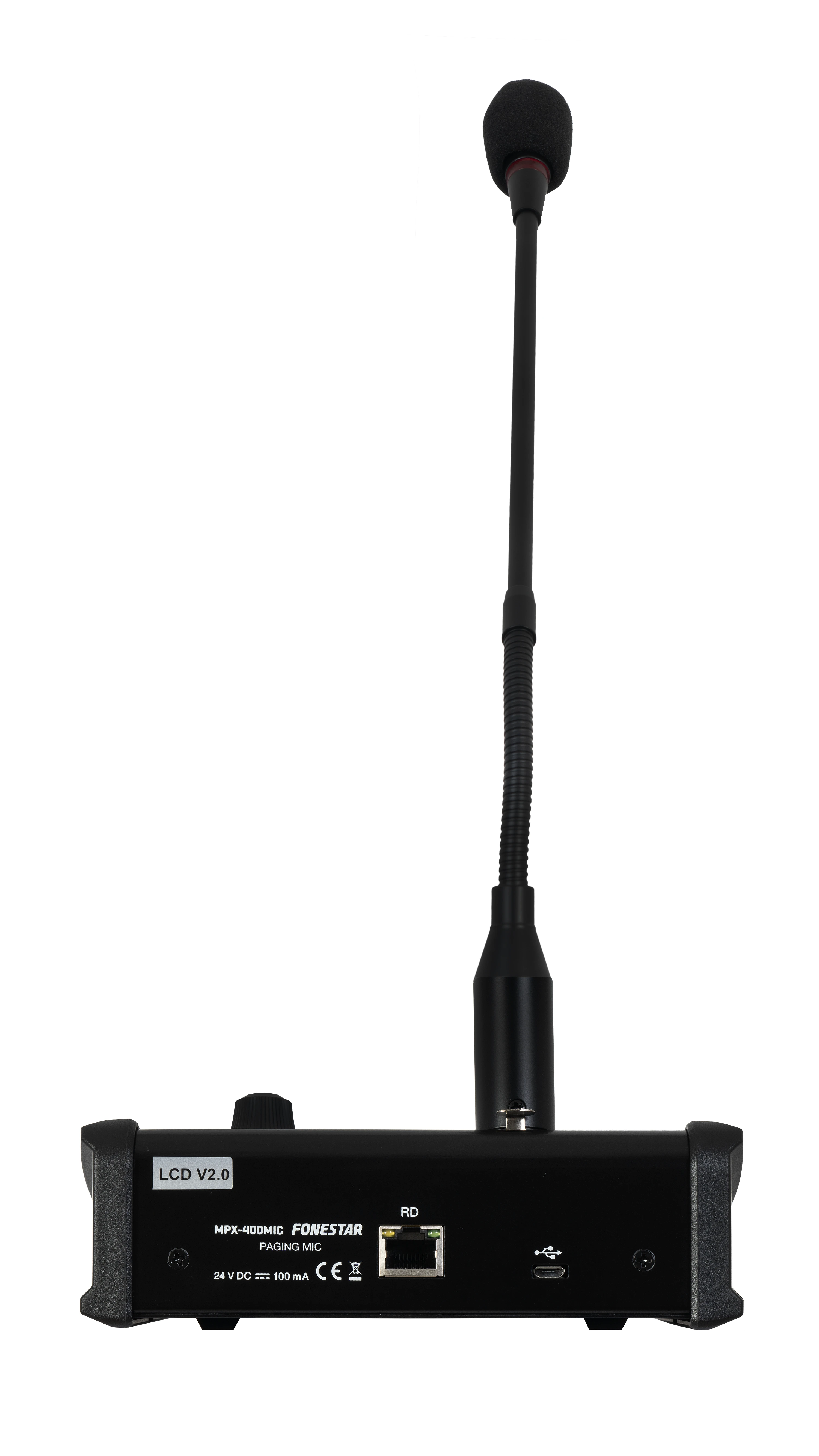 Fonestar MPX-400MIC je zónový mikrofon pro systém MPX-4088, který umožňuje výběr a ovládání až 32 zón. Nabízí spolehlivý hlasový výstup a hudební varovné tóny s jednoduchým připojením přes RJ-45 (Cat 5e). Ideální pro rozsáhlé instalace v komerčních a veřejných prostorech.