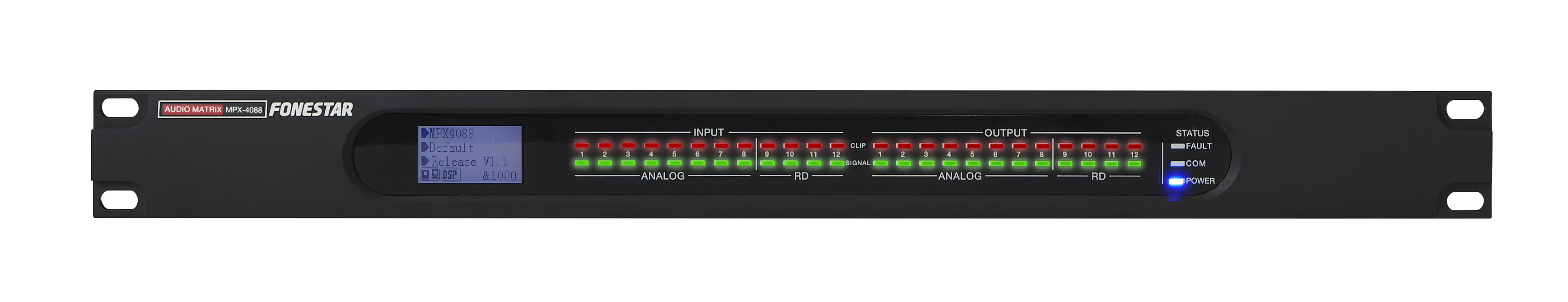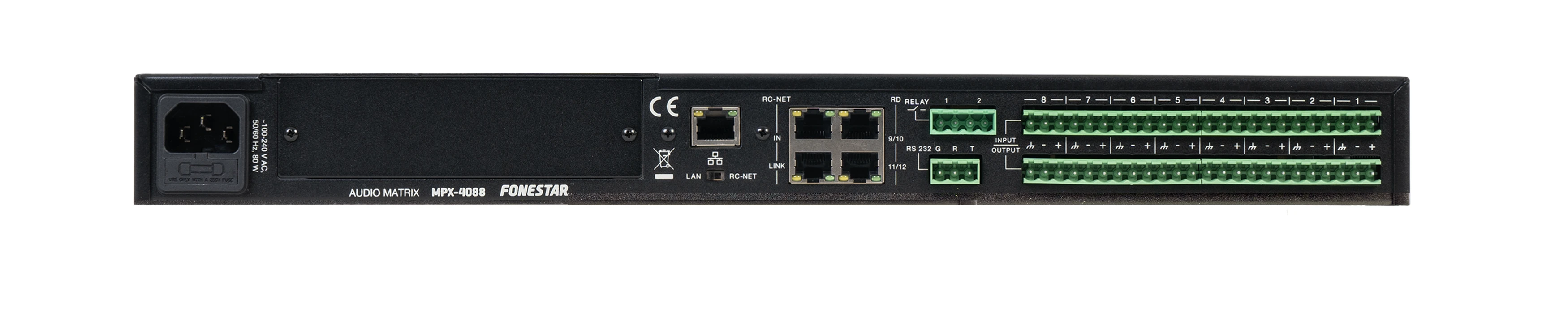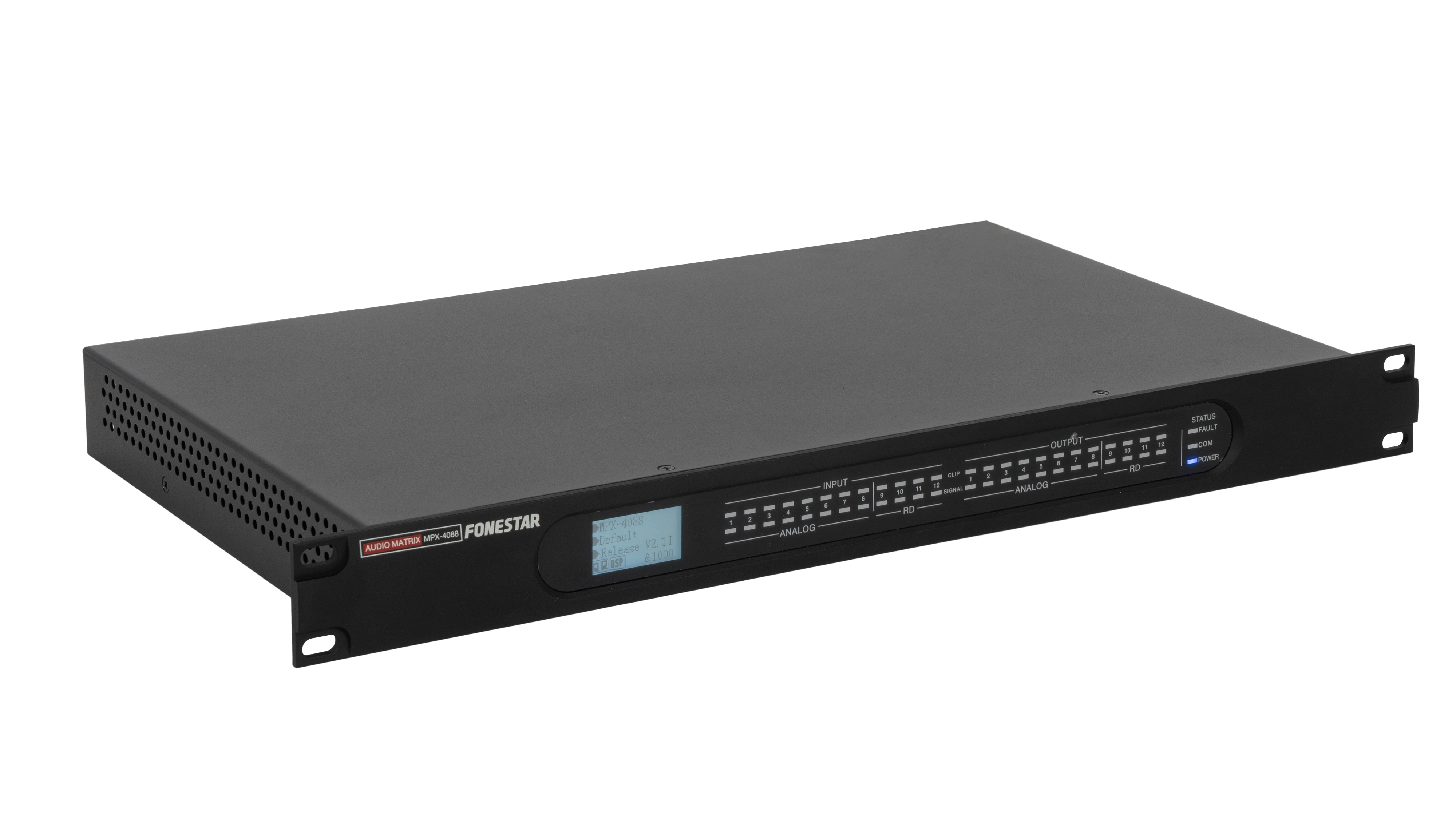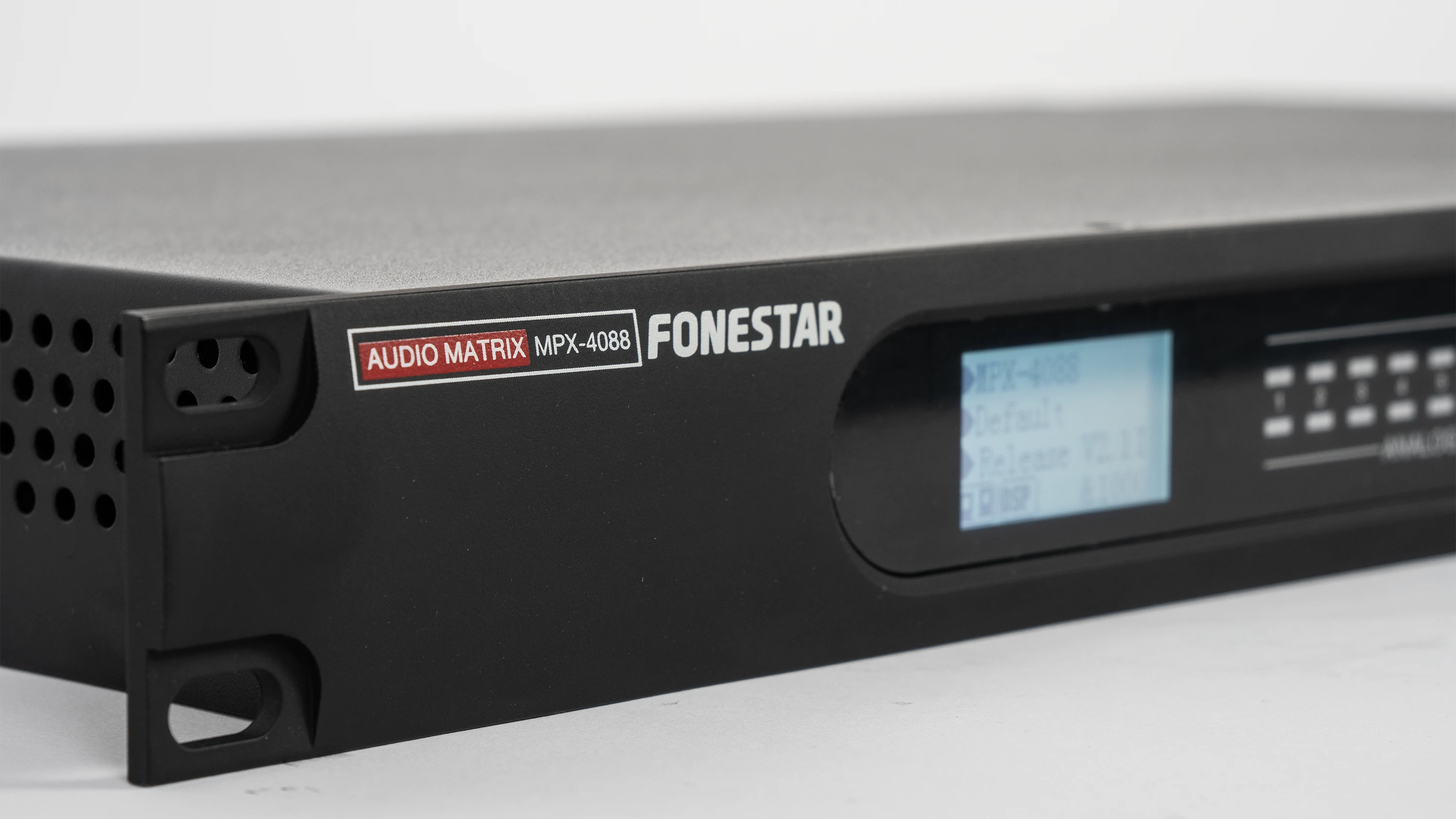 Fonestar MPX-4088 je univerzální 8 × 8 audio matice s DSP procesorem a volitelnou Dante kartou. Nabízí analogové i digitální vstupy a výstupy, pokročilé zpracování signálu a možnost pohodlného ovládání přes software, mobilní aplikace nebo volitelné dálkové ovladače. Ideální pro vícezónové ozvučovací instalace všech velikostí.