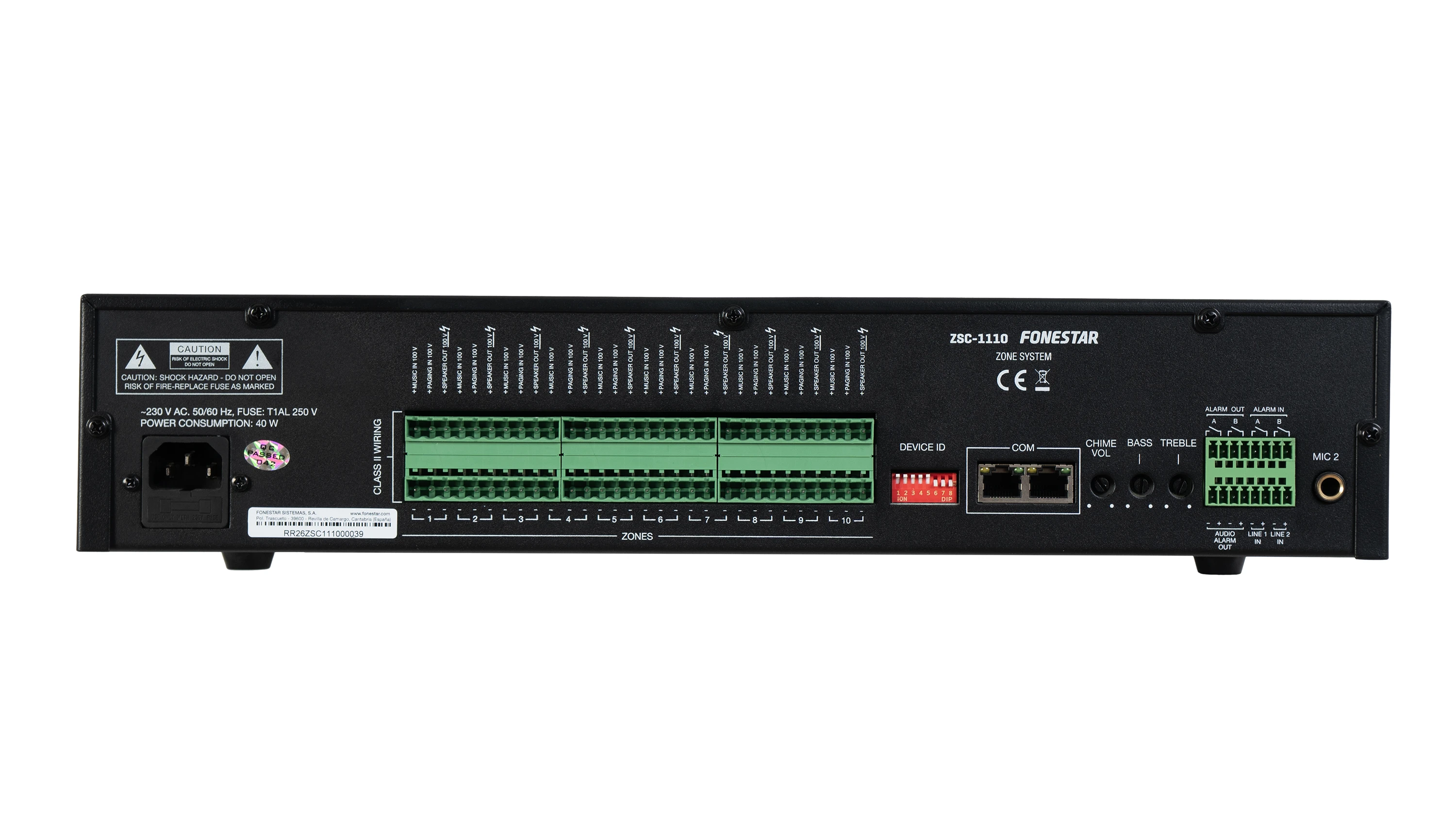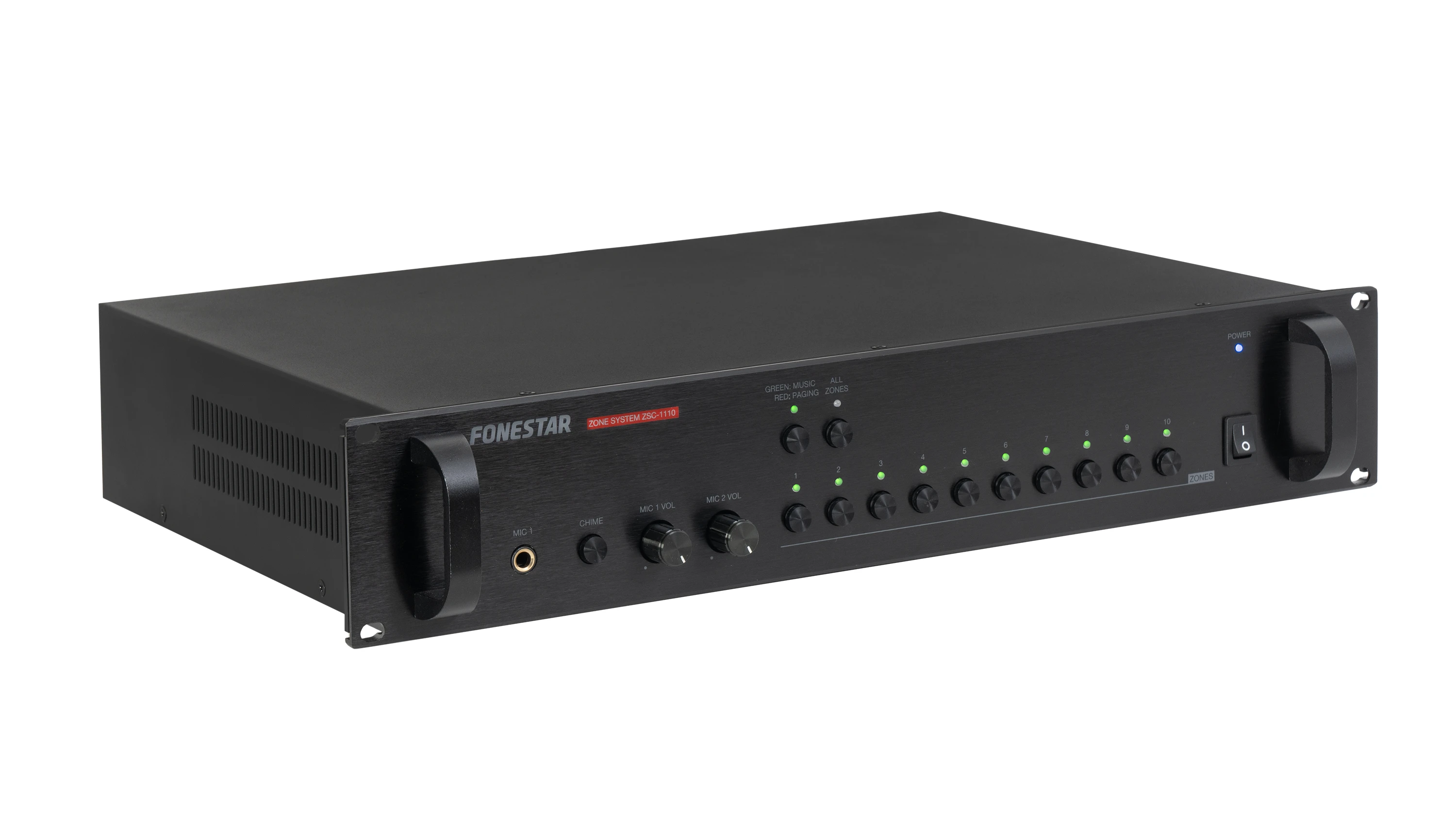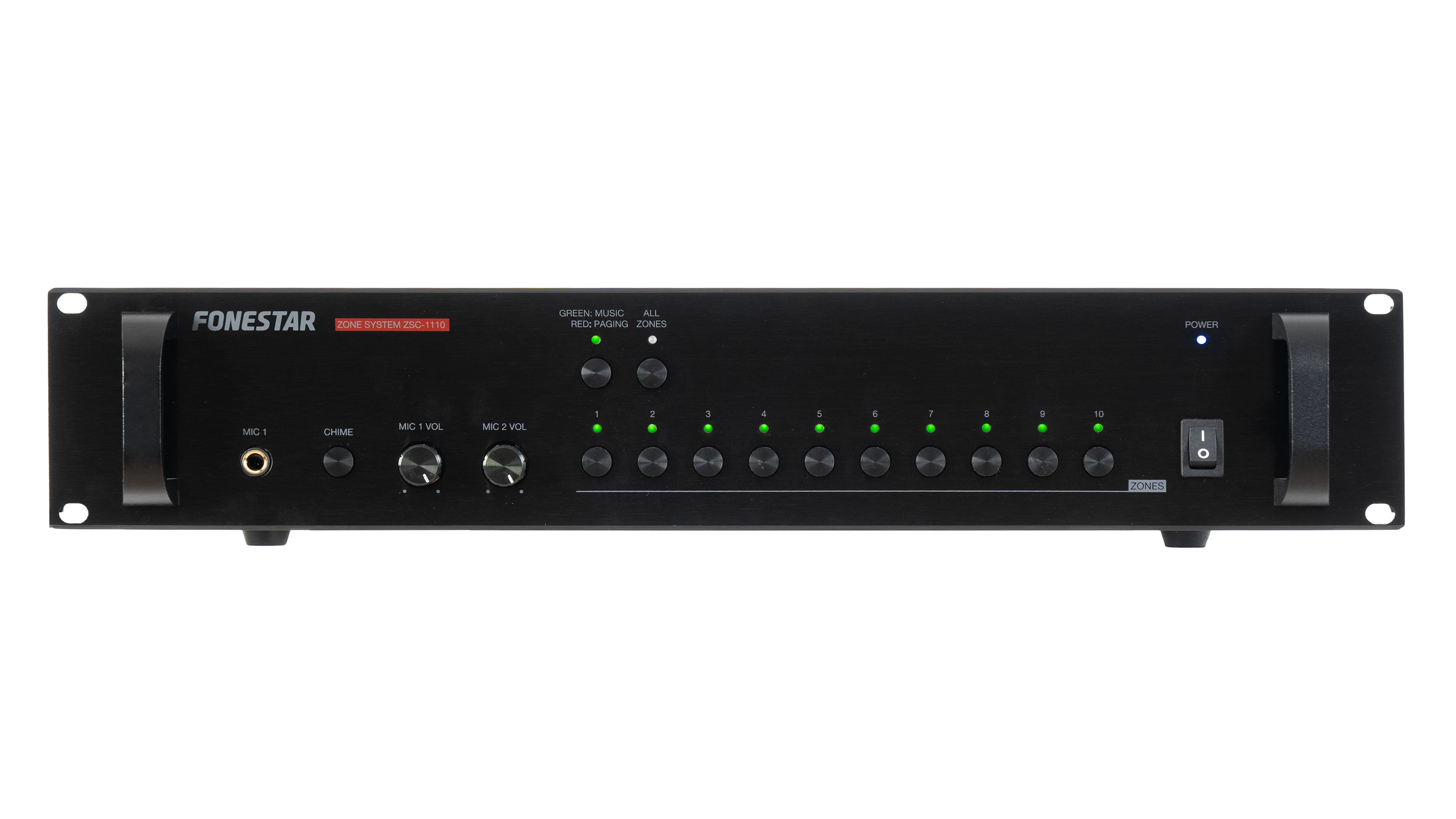 Fonestar ZSC-1110 je 10zónový spínací prvek pro 100V rozvody, rozšiřitelný až na 300 zón. Umožňuje kombinovat hudbu a hlášení v jednotlivých zónách a podporuje až 16 zónových mikrofonů ZS-11 pro paging a řízení systému.