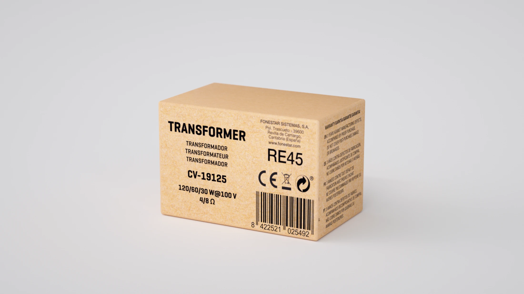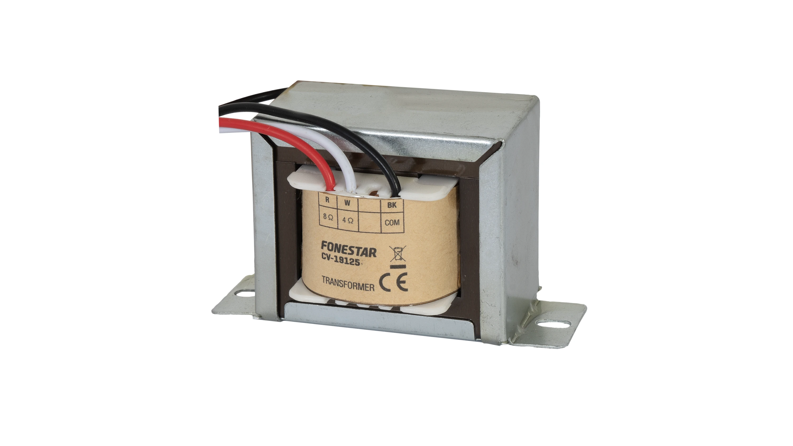 Fonestar CV-19125 je linkový transformátor 100 V pro nízkoimpedanční reproduktory s výkonovými odbočkami 120/60/30 W RMS. Umožňuje začlenění výkonnějších reproduktorů do 100V ozvučovacích systémů.