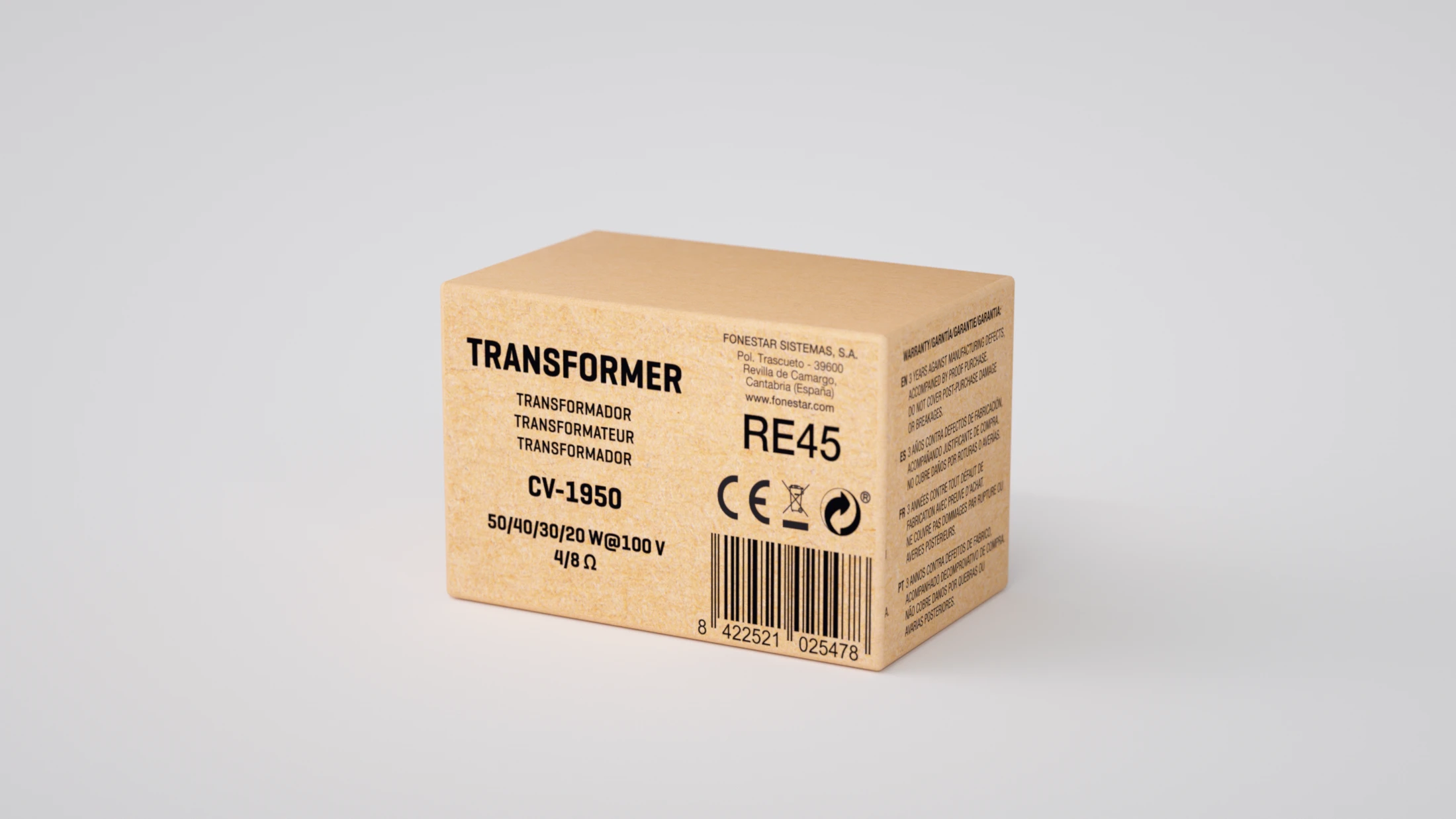 Fonestar CV-1950 je linkový transformátor 100 V pro nízkoimpedanční reproduktory s výkonovými odbočkami 50/40/30/20 W RMS. Umožňuje spolehlivé připojení výkonnějších reproduktorů do 100V ozvučovacích systémů.