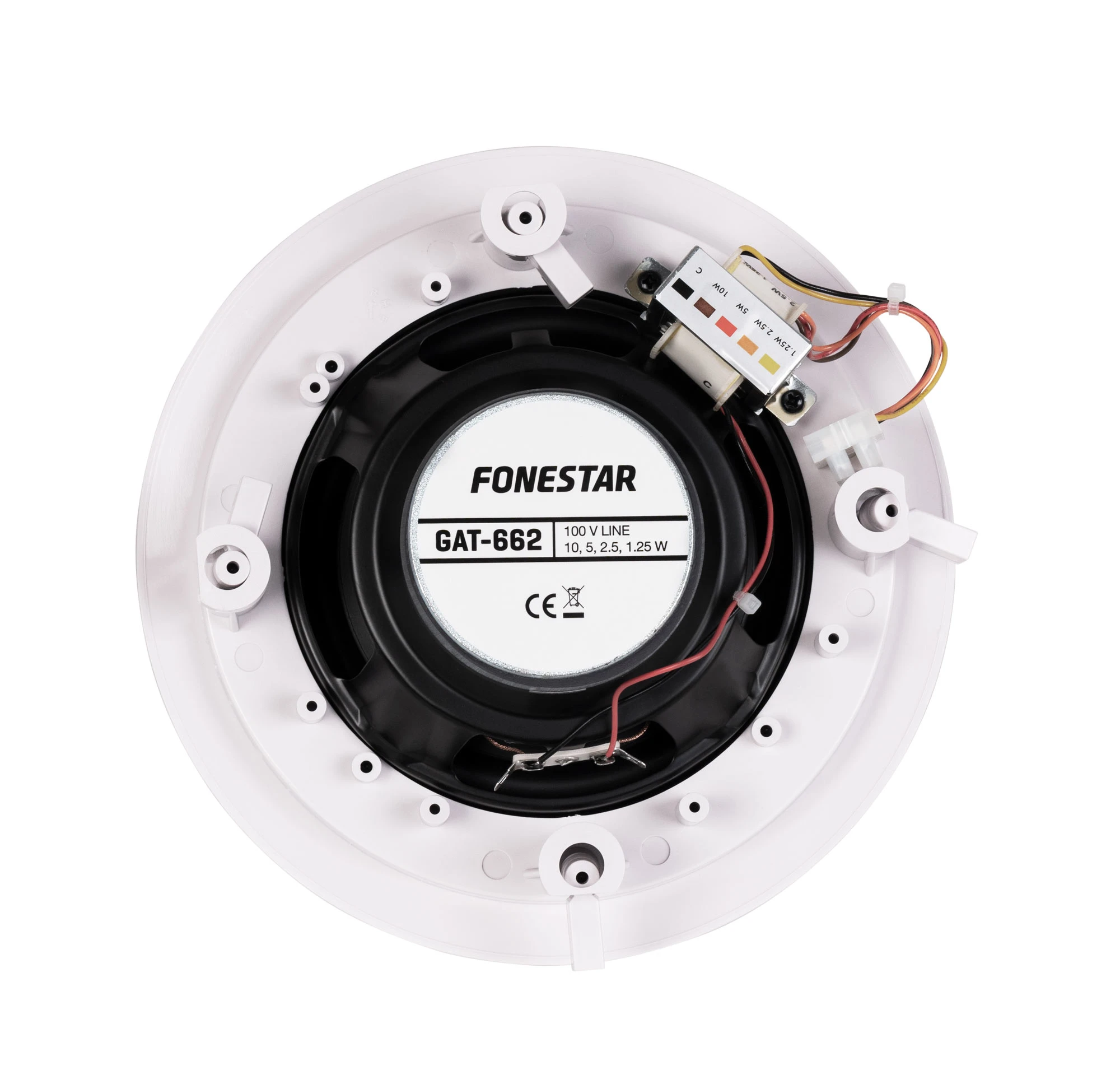 Fonestar GAT-662 je 61” koaxiální stropní reproduktor s výkonem 10 / 5 / 2,5 / 1,25 W RMS při 100 V. Nabízí bohatý, čistý zvuk s výbornou srozumitelností pro hudbu i hlasová hlášení. Konstrukce z ABS plastu a ocelová mřížka zajišťují dlouhou životnost. Díky rychlému kotevnímu systému se snadno instaluje a zapadne do jakéhokoli interiéru.