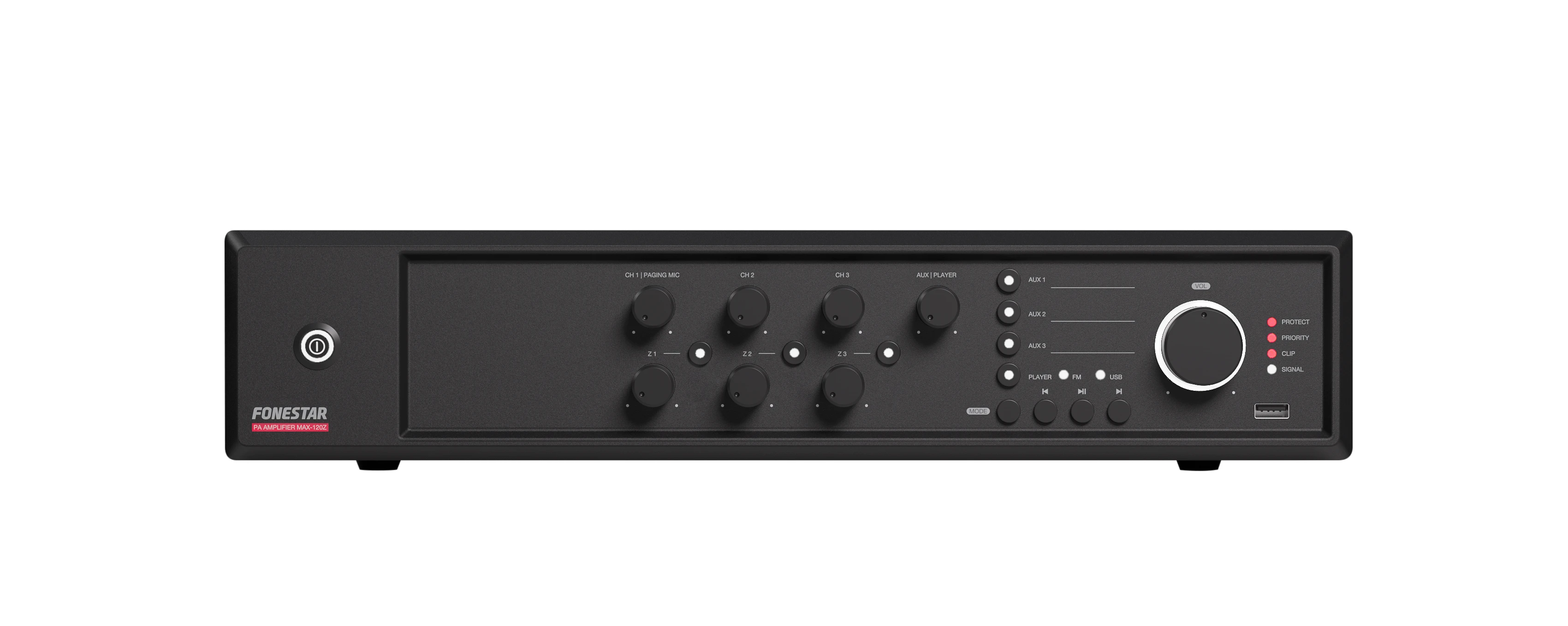 Fonestar MAX-120Z je vícezónový PA zesilovač třídy D s výkonem 120 W RMS a třemi nezávislými zónami. Nabízí vysokou účinnost, nízkou spotřebu a vynikající kvalitu zvuku. Vestavěný přehrávač USB/FM poskytuje pohodlný zdroj hudby na pozadí. Díky kombinaci 100 V a nízkoimpedančních výstupů je ideální pro ozvučení obchodů, škol, restaurací či veřejných prostor. Elegantní design a snadné ovládání umožňují použití jako stolní i rackové zařízení.