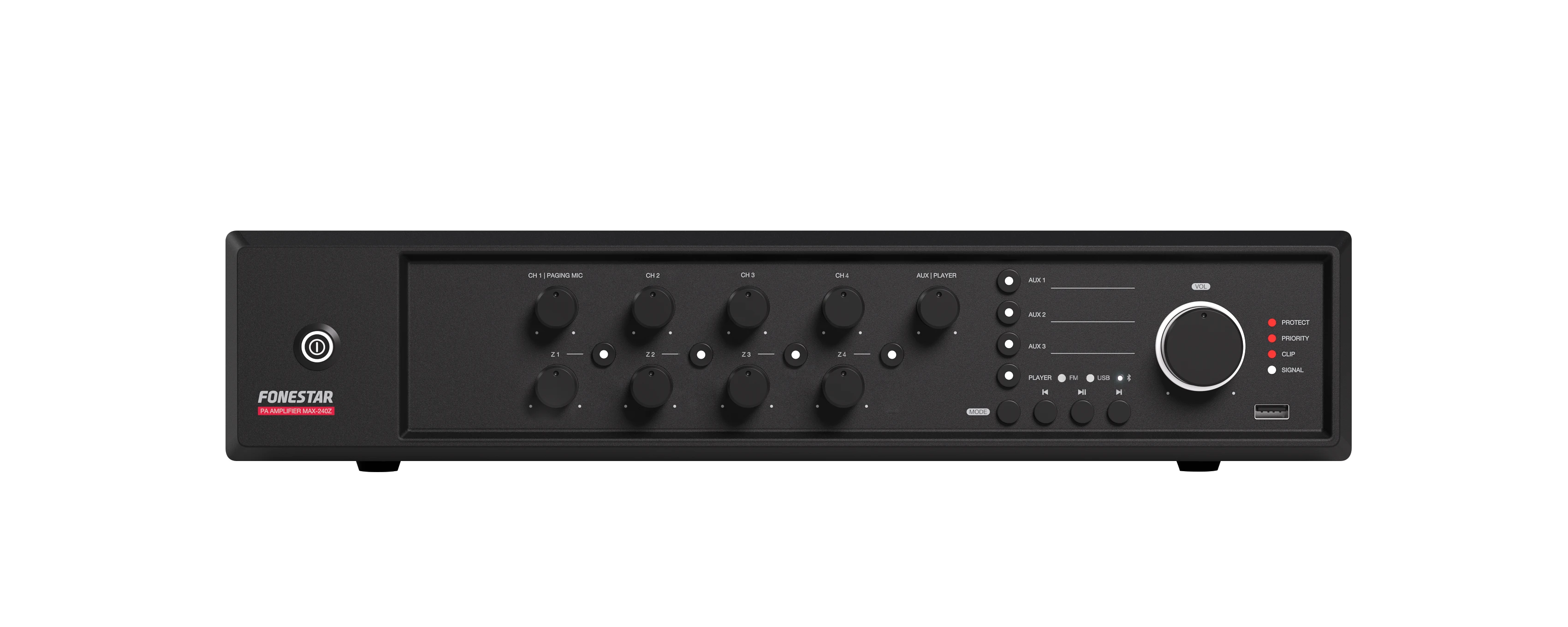 Fonestar MAX-240Z je vícezónový PA zesilovač třídy D s výkonem 240 W RMS a čtyřmi nezávislými zónami. Nabízí vysokou účinnost, spolehlivost a čistý zvuk při dlouhodobém provozu. Vestavěný přehrávač Bluetooth®, USB a FM umožňuje pohodlné přehrávání hudby na pozadí, zatímco mikrofonní vstupy s prioritní funkcí zajišťují flexibilní řízení ozvučení. Díky kombinaci 100 V a nízkoimpedančních výstupů je ideální pro ozvučení obchodů, škol, restaurací či kulturních prostor.