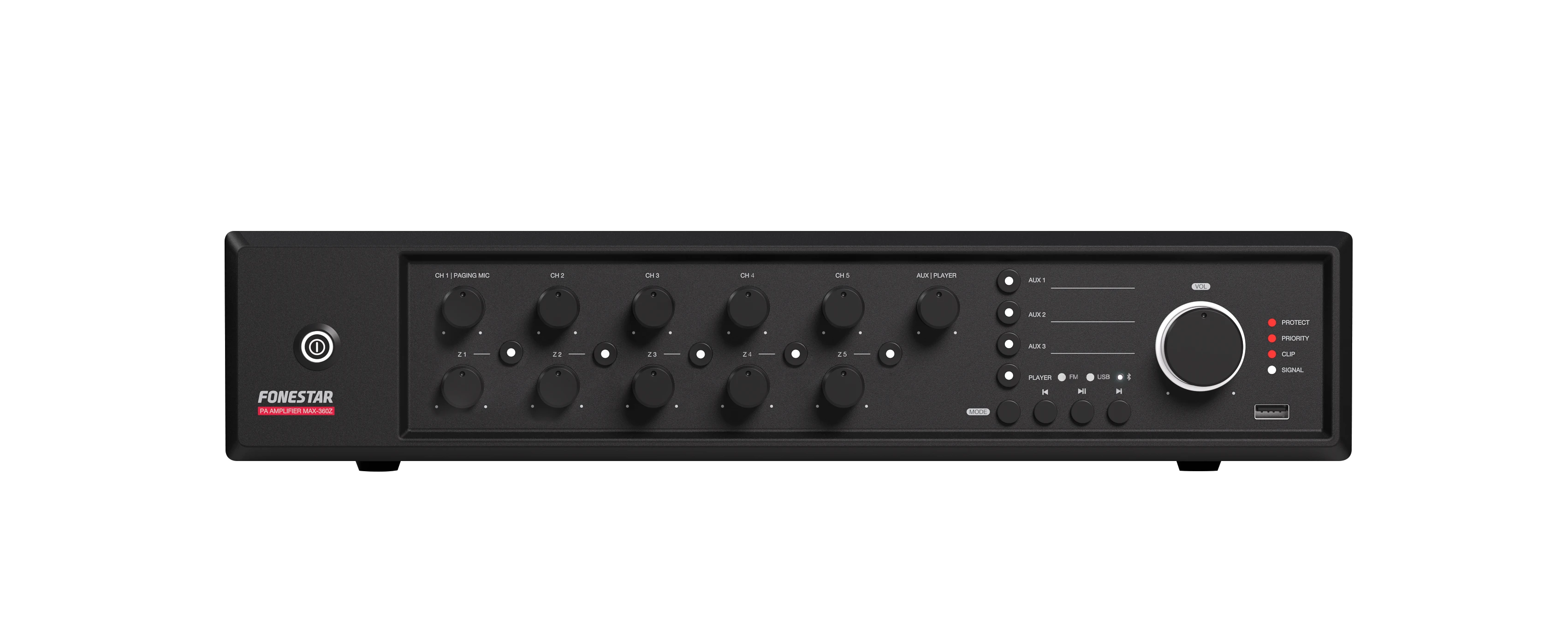 Fonestar MAX-360Z je vícezónový PA zesilovač třídy D s výkonem 360 W RMS a pěti nezávislými zónami. Nabízí vysokou účinnost, čistý zvuk a dlouhodobě spolehlivý provoz. Vestavěný přehrávač Bluetooth®, USB a FM zajišťuje pohodlné přehrávání hudby na pozadí, zatímco mikrofonní vstupy s prioritou umožňují efektivní hlášení do jednotlivých zón. Díky kombinaci 100 V a nízkoimpedančních výstupů je ideální pro ozvučení komerčních, vzdělávacích i veřejných prostor.
