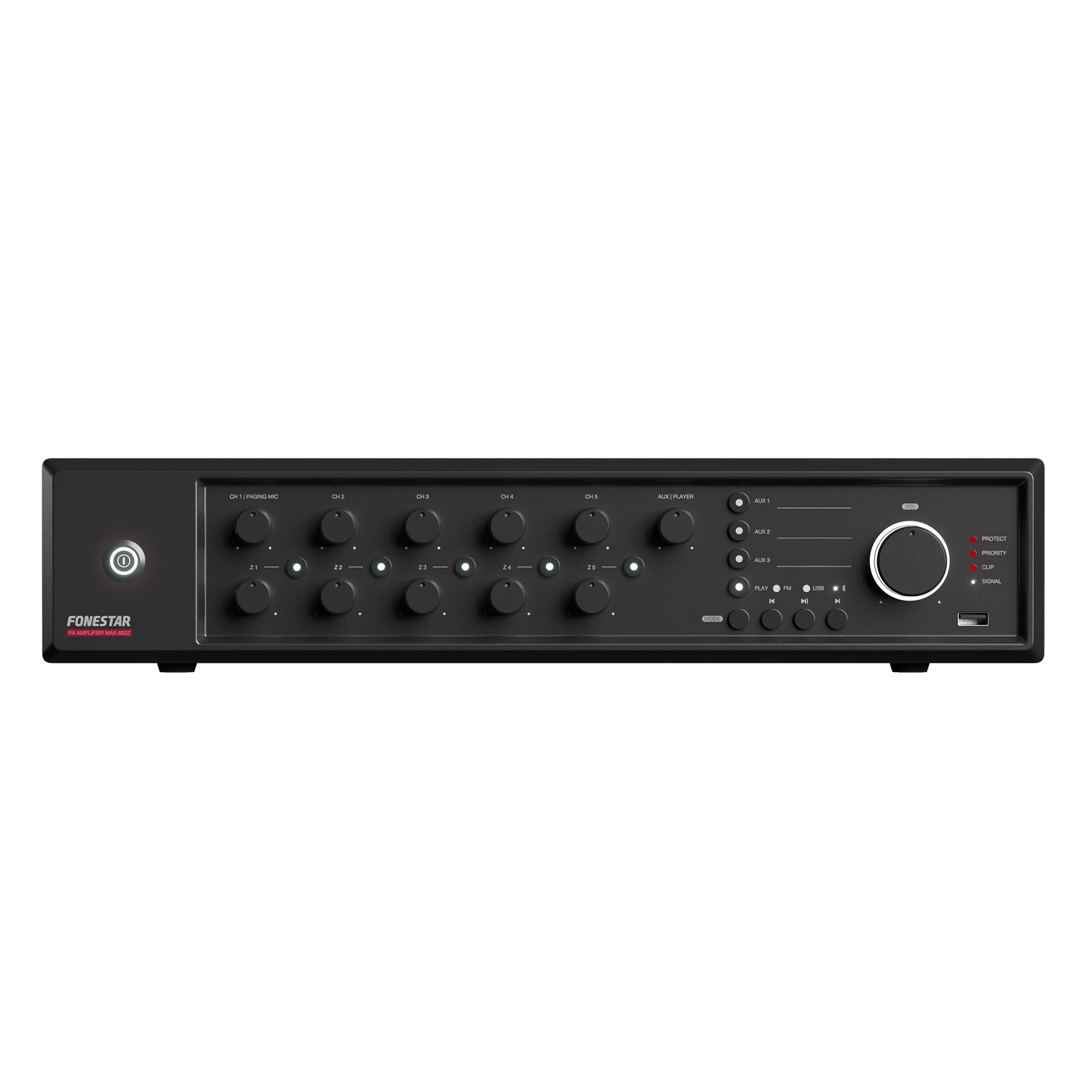 Fonestar MAX-600Z je vícezónový PA zesilovač třídy D s výkonem 600 W RMS, navržený pro profesionální instalace s požadavkem na vysoký výkon, flexibilní řízení zón a maximální spolehlivost. Nabízí 5 samostatných výstupních zón s nezávislým ovládáním, vestavěný přehrávač Bluetooth®, USB a FM a možnost dálkového ovládání přes nástěnný panel nebo zónový mikrofon ZONEMIC-6. Díky spínanému napájecímu zdroji SMPS a tichému chlazení bez ventilátoru zajišťuje energeticky úsporný a bezúdržbový provoz. Ideální řešení pro školy, hotely, obchodní centra, restaurace a veřejné prostory.