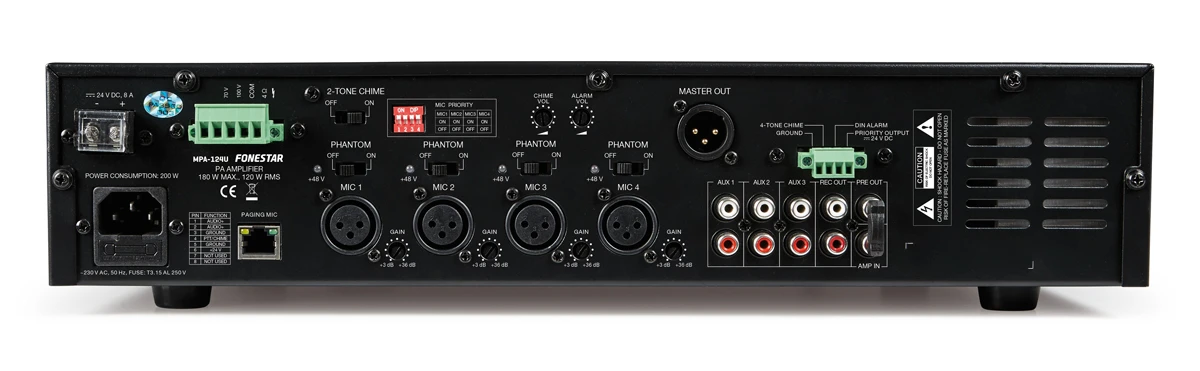 Fonestar MPA-124U je jednozónový PA zesilovač s výkonem 120 W RMS, určený pro profesionální ozvučení komerčních prostor. Nabízí vestavěný USB/SD přehrávač, 4 volitelné vstupy (mikrofonní a pomocné) a funkce prioritního řízení pro hlášení a evakuační systémy. Zesilovač podporuje přehrávání hudby na pozadí i oznamování s využitím různých zvukových tónů. Vhodný pro obchody, restaurace, školy, kanceláře a veřejné prostory.