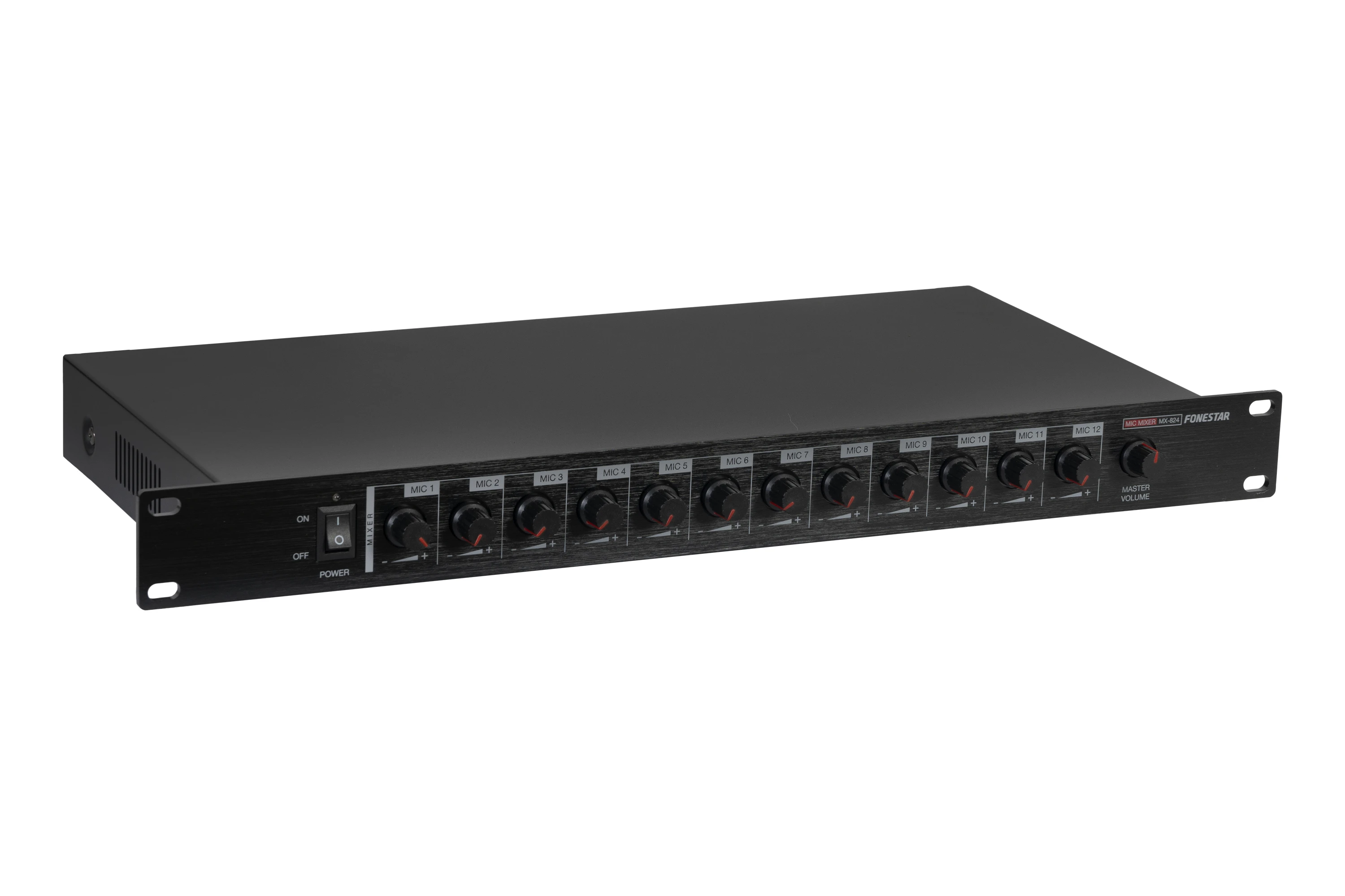 Fonestar MX-824 je 12kanálový analogový mikrofonní mixér s nezávislým ovládáním hlasitosti každého kanálu a 48V fantomovým napájením. Umožňuje snadné rozšíření počtu mikrofonních vstupů v PA systémech a poskytuje jeden stereo výstup pro připojení k zesilovači nebo dalšímu zařízení. Spolehlivé řešení pro konferenční sály, instalace veřejného ozvučení a studiové aplikace.