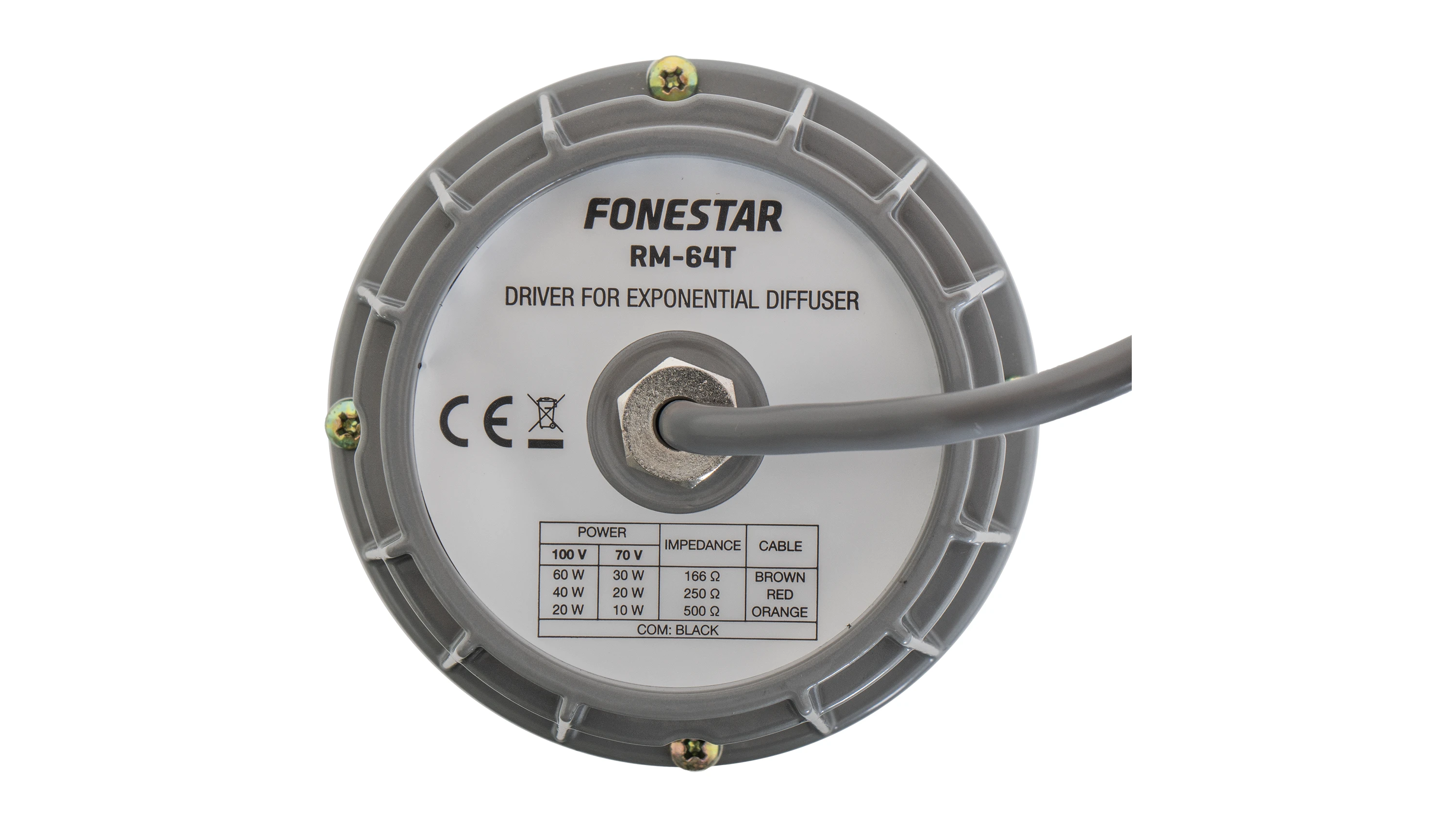 Fonestar RM-61T a RM-64T jsou budiče se 100 V síťovým transformátorem o výkonu 60 / 40 / 20 W RMS, určené pro připojení k exponenciálním difuzorům. Jsou vybaveny standardním závitem 1 3/8” a vyznačují se kompaktní, odolnou konstrukcí. Poskytují vysokou účinnost, čistý zvuk a dlouhou životnost. Ideální pro venkovní systémy veřejného ozvučení, sportoviště a průmyslové objekty.