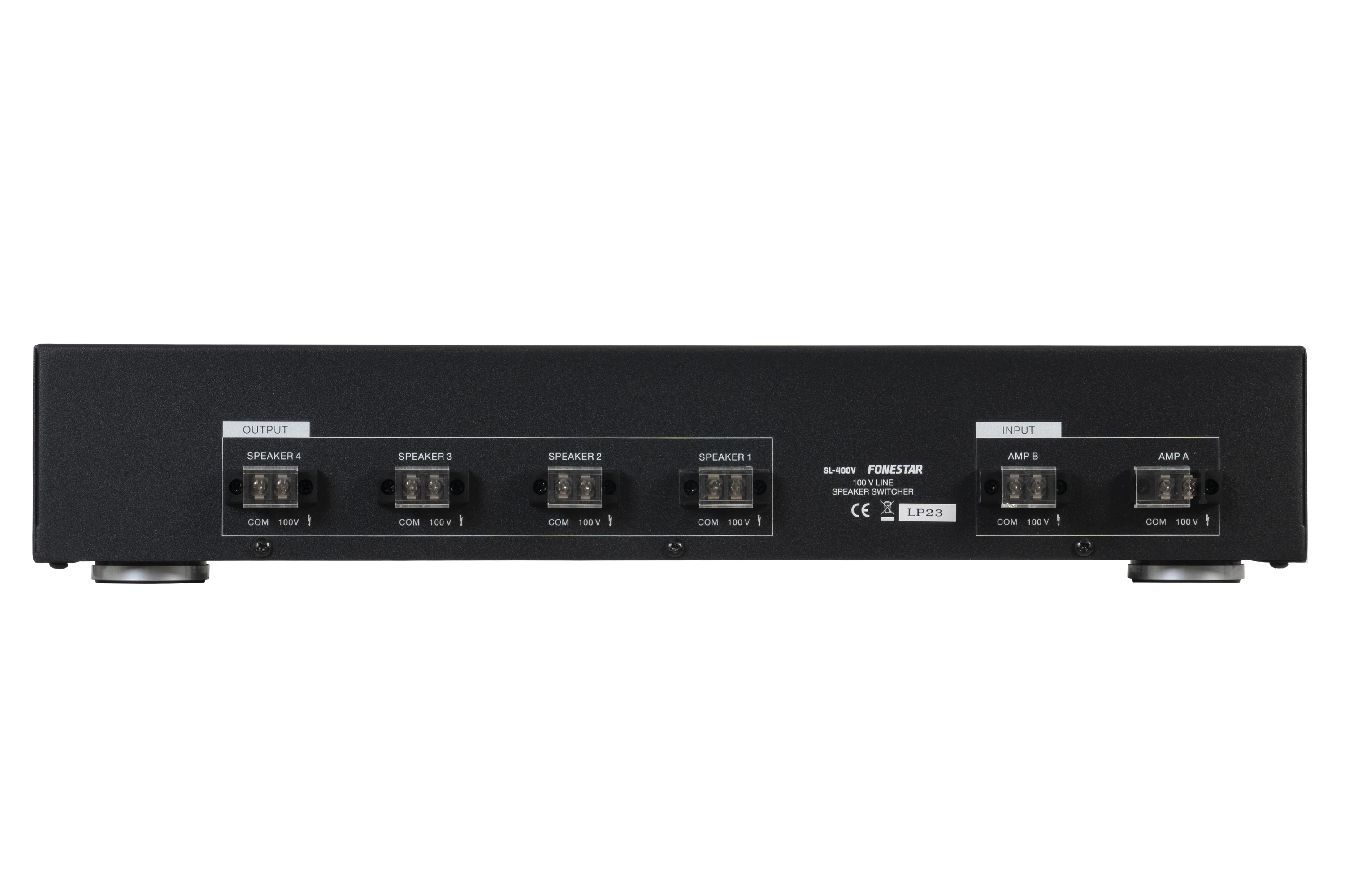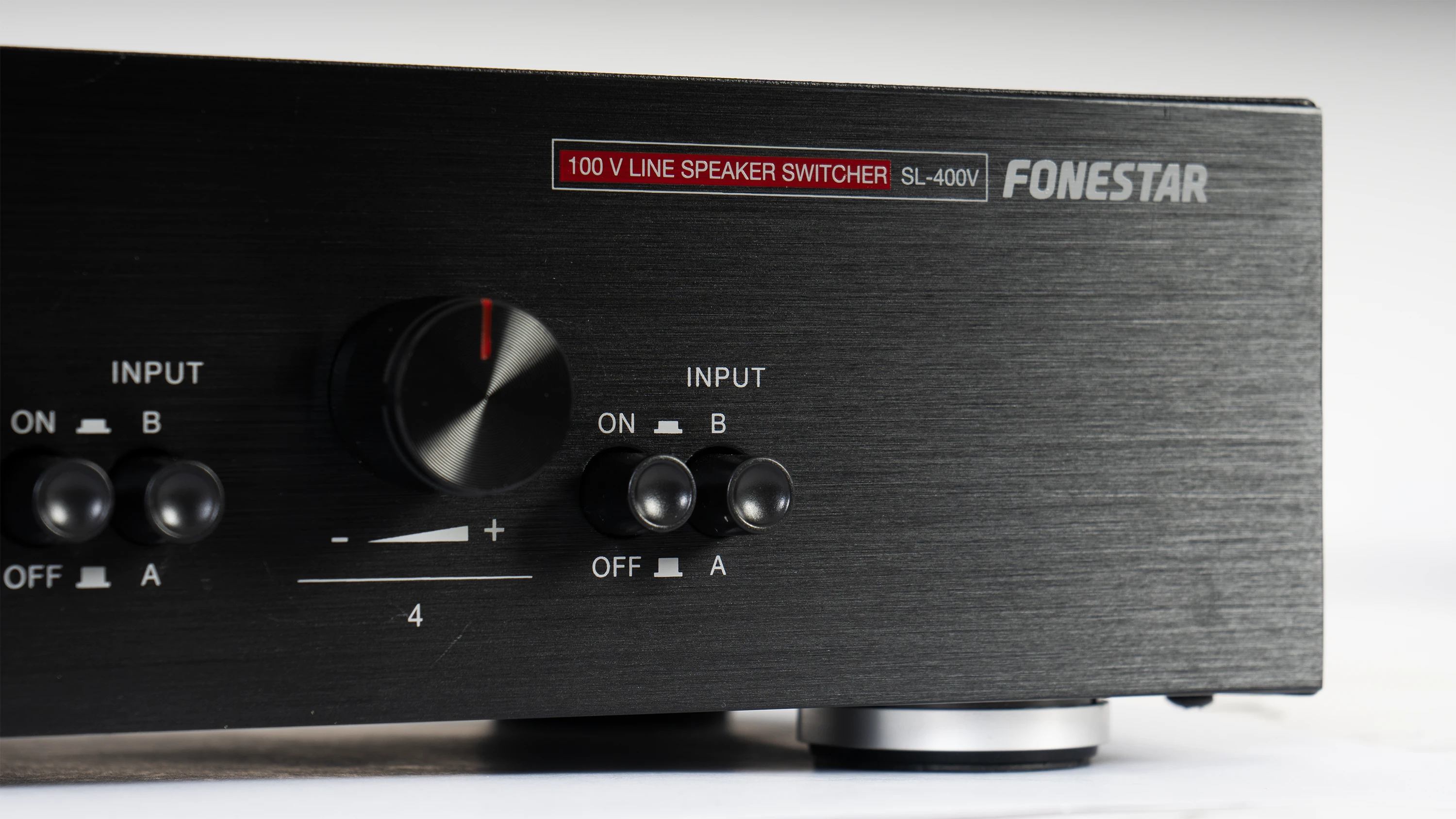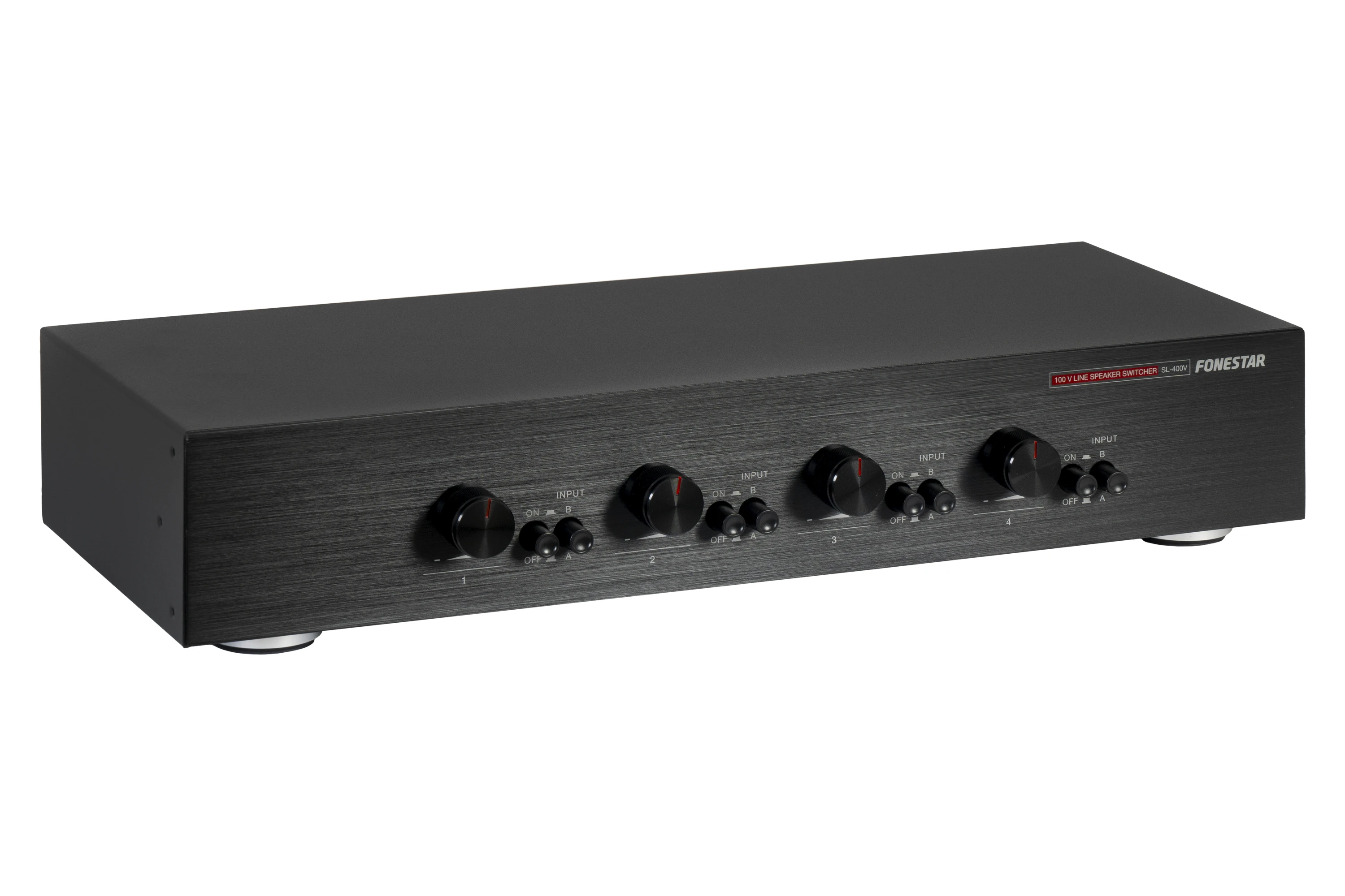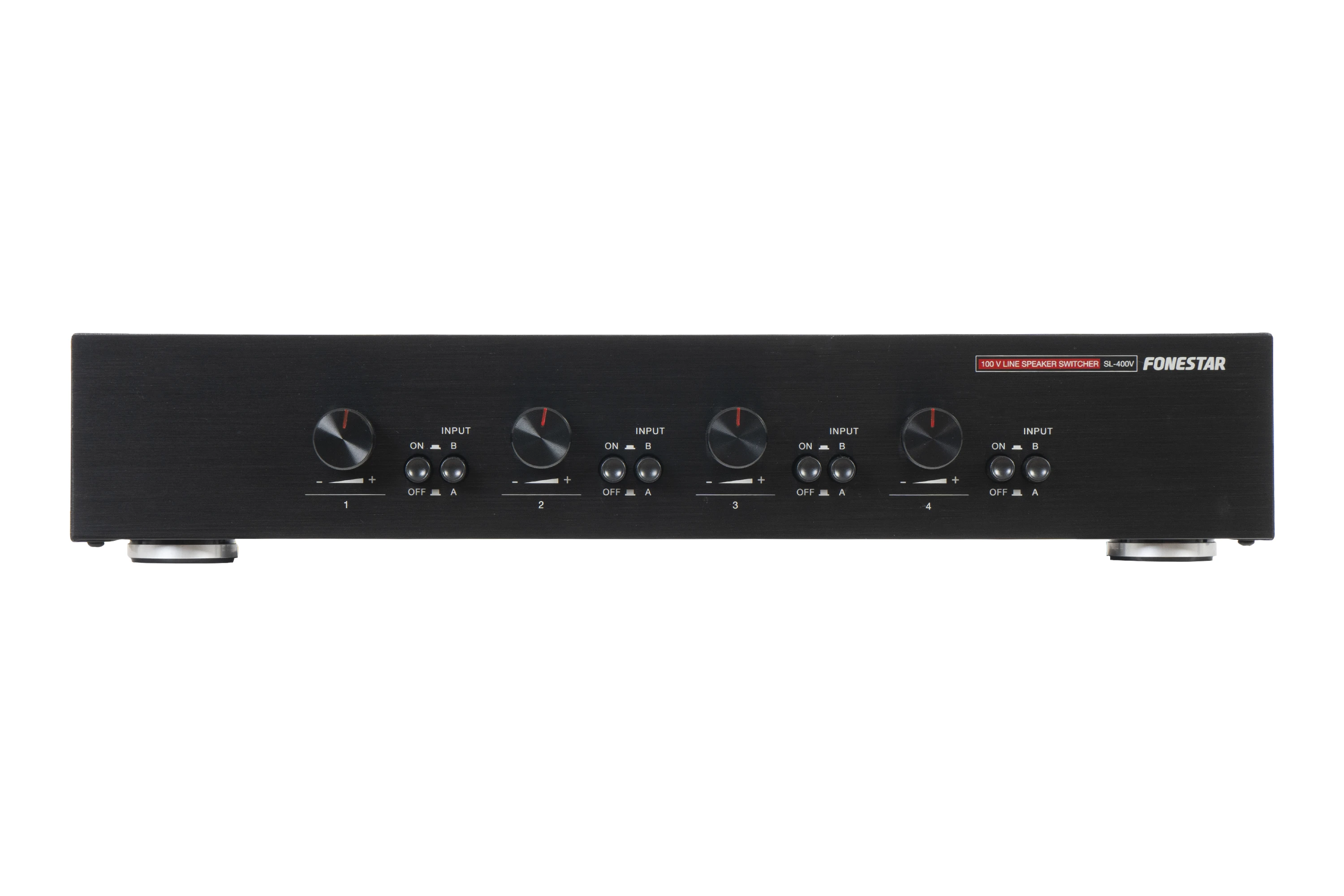 Fonestar SL-400V je čtyřkanálový 100 V monofonní volič reproduktorů s nezávislým ovládáním hlasitosti a volbou vstupu. Umožňuje připojení až čtyř reproduktorových okruhů na dva výstupy zesilovače. Vhodný pro vícezónové ozvučovací systémy a profesionální instalace, kde je požadováno lokální řízení hlasitosti a výběr zdroje signálu.