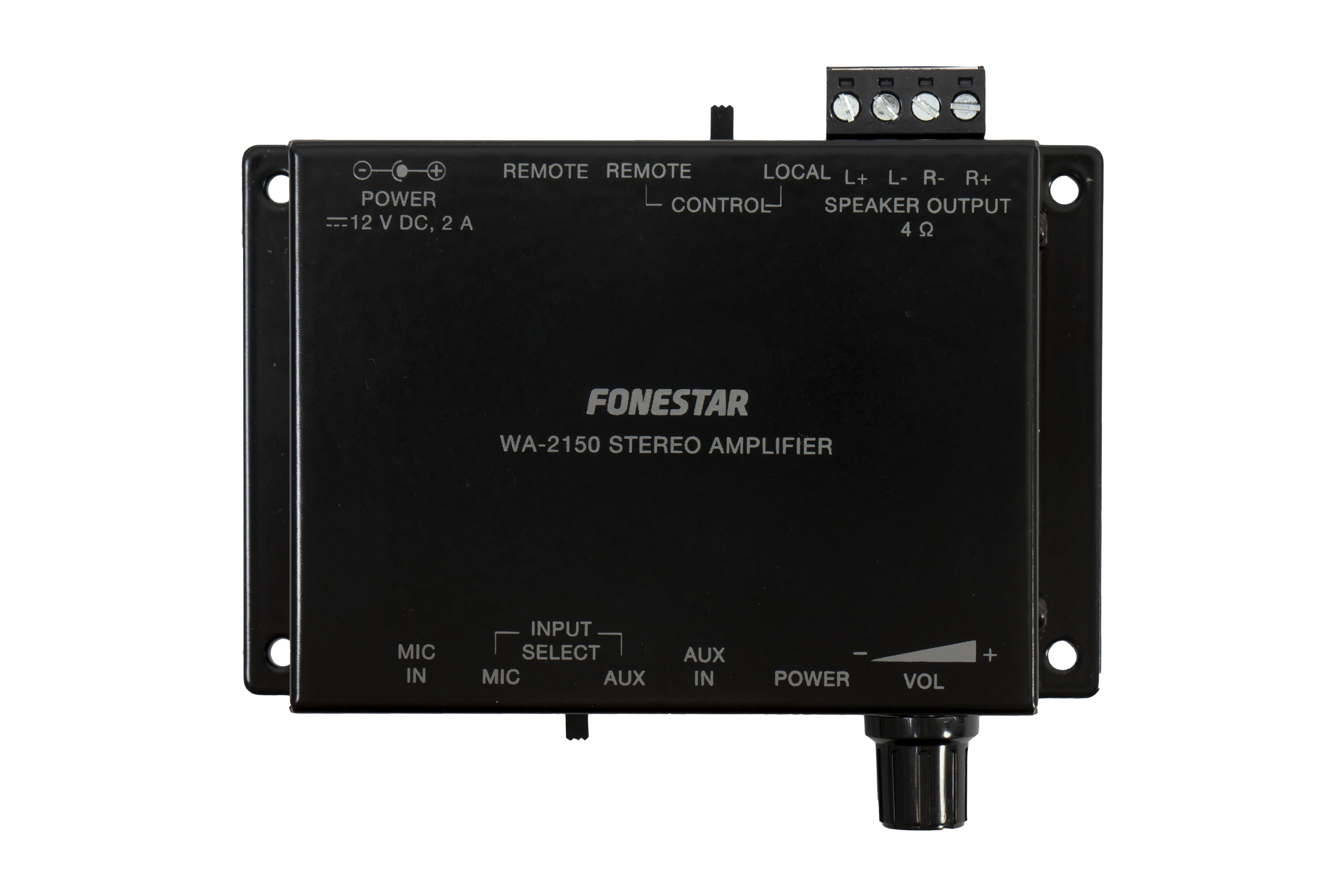 Fonestar WA-2150 je kompaktní stereofonní zesilovač třídy D (15 + 15 W RMS @ 4 ?) v povrchovém pouzdře pro skrytou montáž. Nabízí MIC/AUX vstupy, euroblock výstupy a volitelné dálkové ovládání napájení/hlasitosti.