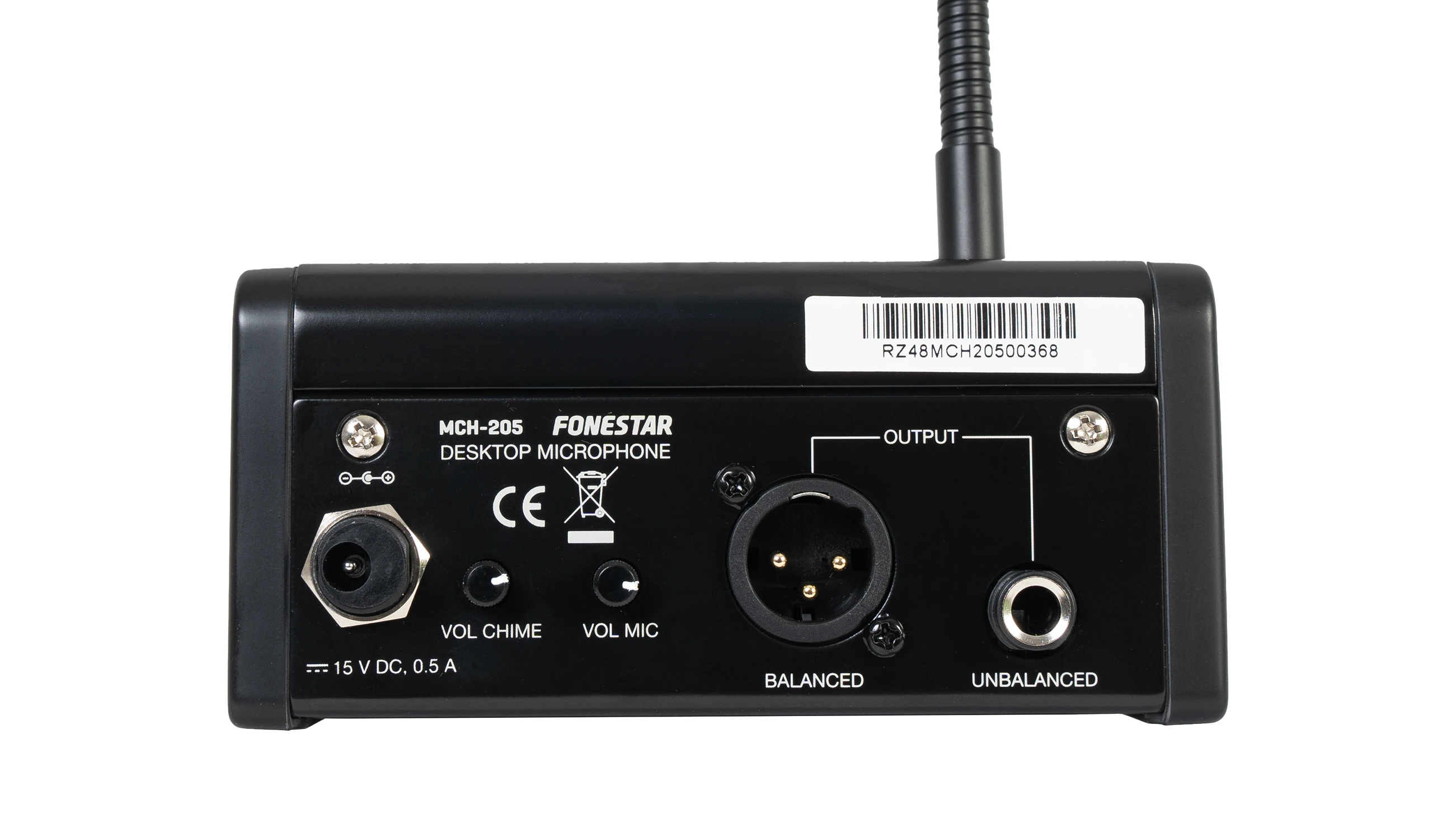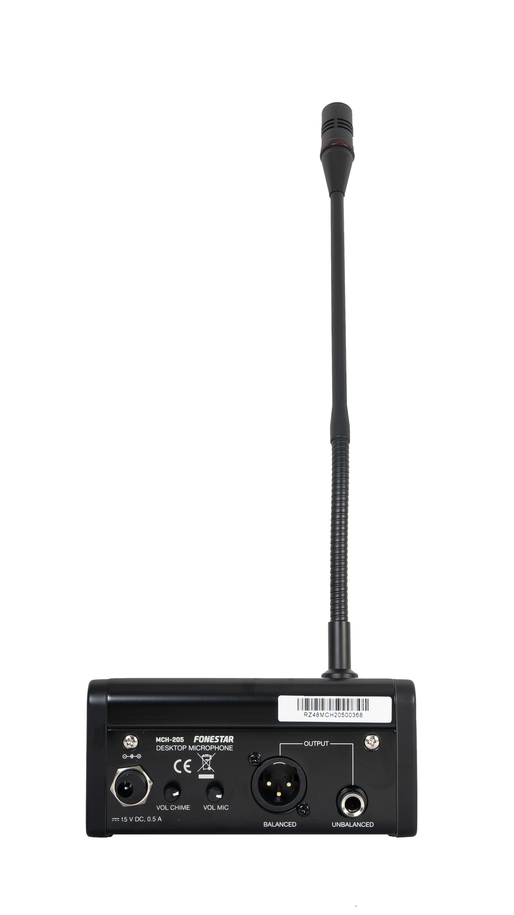 MCH-205 je stolní kondenzátorový mikrofon s předzesilovačem a hudebními varovnými tóny. Kardioidní směrovost, podsvětlené tlačítko, nezávislé ovládání hlasitosti a symetrický linkový výstup pro bezrušný přenos na dlouhé vzdálenosti.