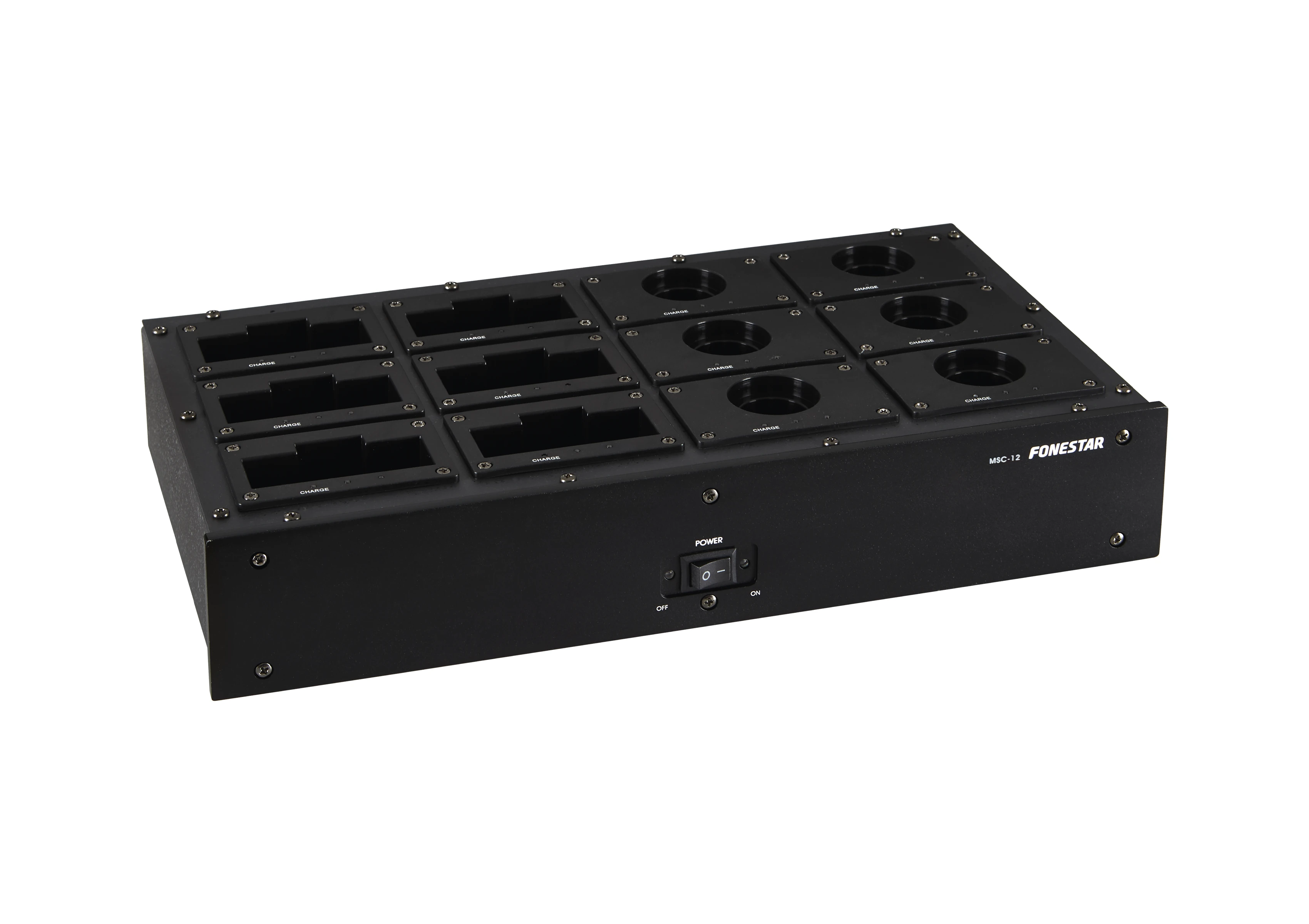 MSC-12 je dokovací a nabíjecí stanice až pro 12 zařízení (MSHT-40M, MSHT-45P, RI-840). Konfigurovatelné vložky pro ruční/páskové vysílače, přehledné indikátory nabíjení a snadná přeprava.