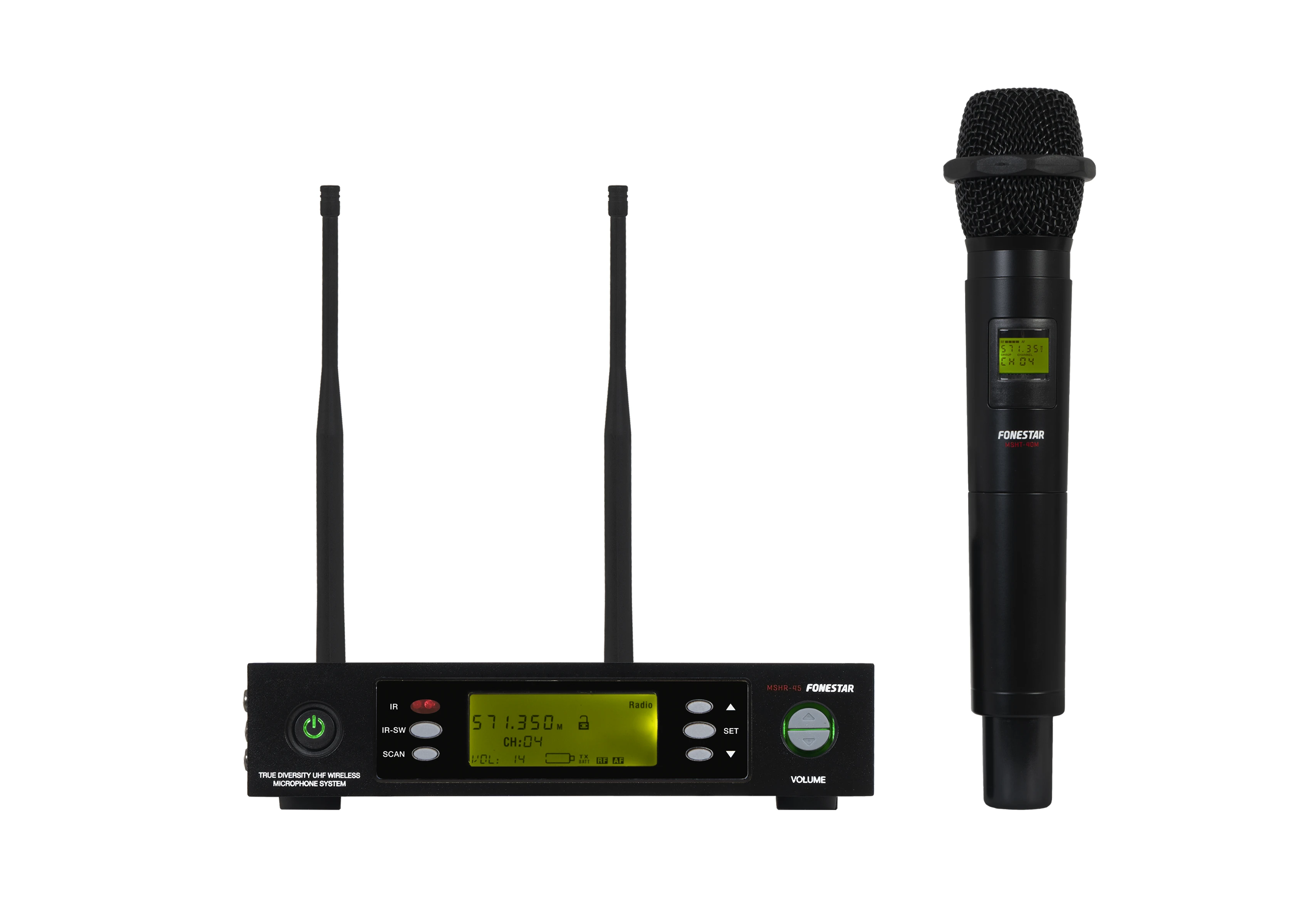 Jednokanálový bezdrátový UHF systém se skutečnou diverzitou a ručním mikrofonem. 32 frekvencí (512–525 MHz), auto-scan, IR sync. Symetrický/nesymetrický výstup. 19" 1U držák pro 2 přijímače + 1× 6,3 mm mono kabel.