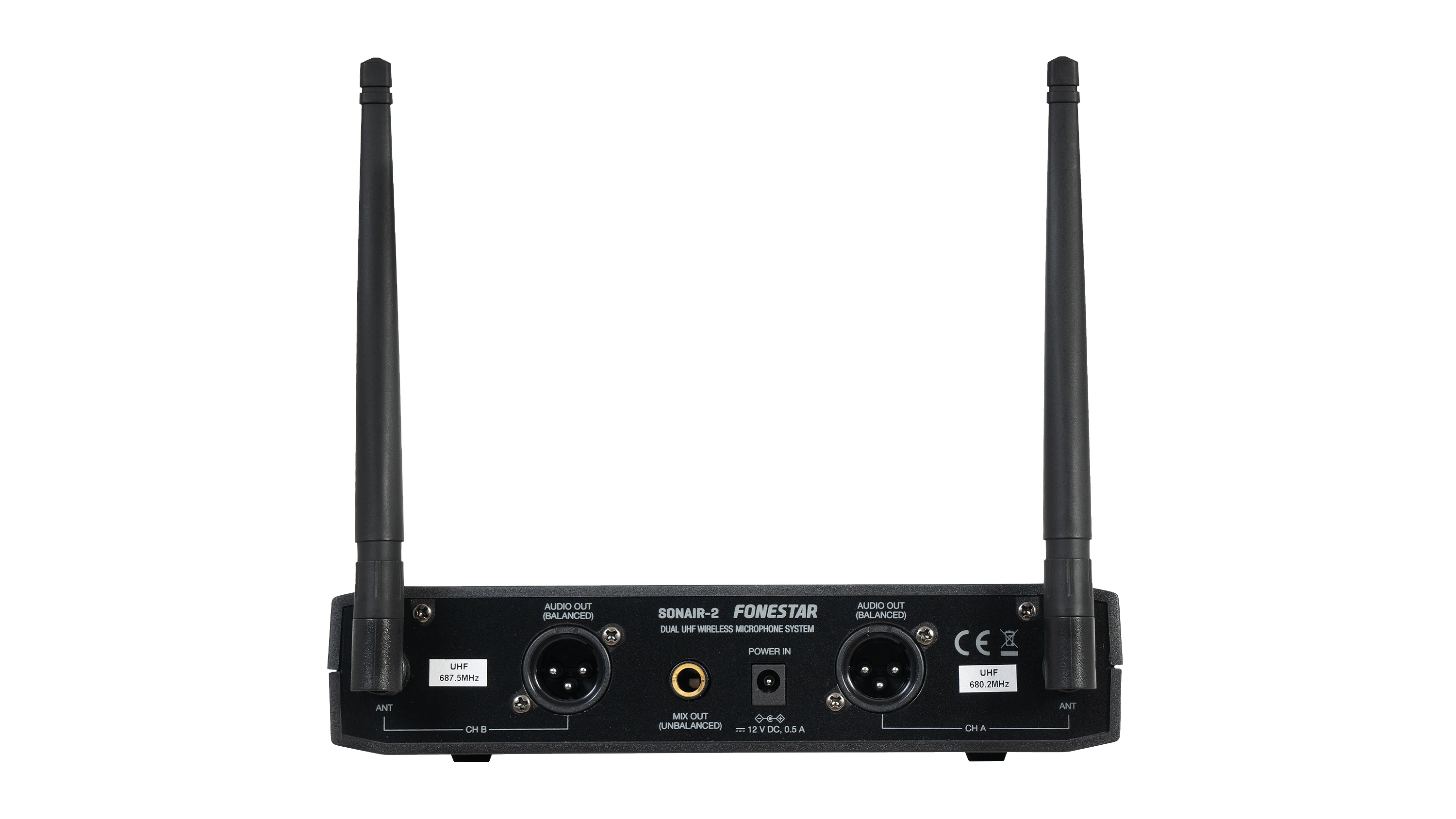 Duální ruční bezdrátový mikrofon UHF 550-700 MHz s pevnou přenosovou frekvencí, 8 dostupných kanálů, vynikající dosah a kvalita zvuku, integrovaná technologie řízení audia a přenosu.