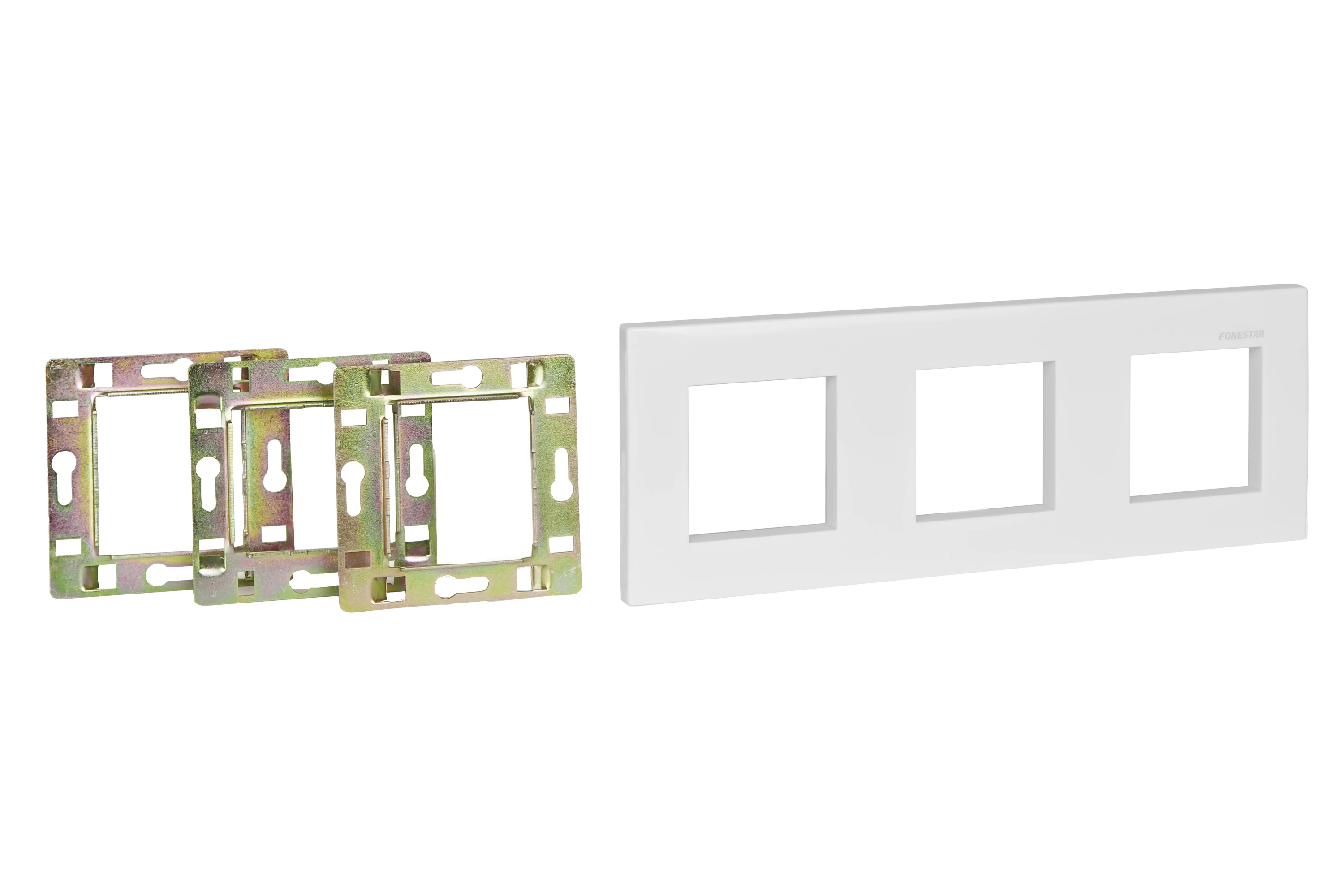 Krycí rám a instalační základna Fonestar WP-220MCH je modulární instalační rámeček s třemi kovovými podložkami určený k instalaci do tří standardních evropských zapuštěných krabic (datových/elektrických). V rámci spojovacího panelového systému umožňuje upevnění a estetické zakončení tří modulárních připojovacích panelů (např. datových, AV či audio konektorů) v aplikacích jako jsou audiovizuální instalace, učebny, zasedací místnosti, konferenční prostory nebo pracoviště. Rám je v bílé barvě (RAL 9003) a má rozměry 220 × 80 mm, přičemž každé z tří otvorů odpovídá standardizovanému modulu panelu z portfolia Fonestar.