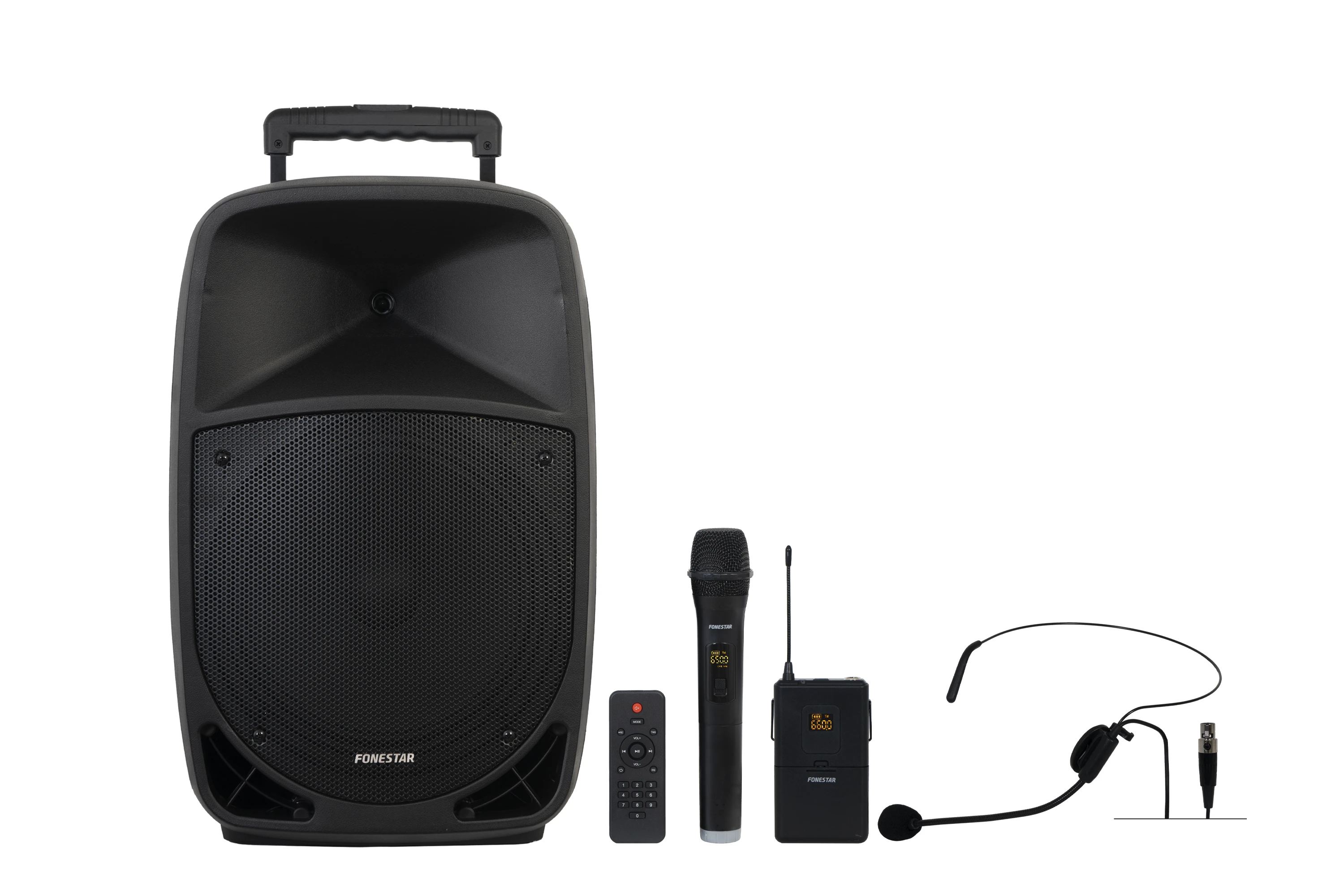Přenosný reproduktor 12″. Maximální výkon 250 W, 2 UHF bezdrátové mikrofony (1 ruční, 1 headset), Bluetooth/USB/microSD/FM/LINE přehrávač, možnost připojení kytary a výstup pro další reproduktor.