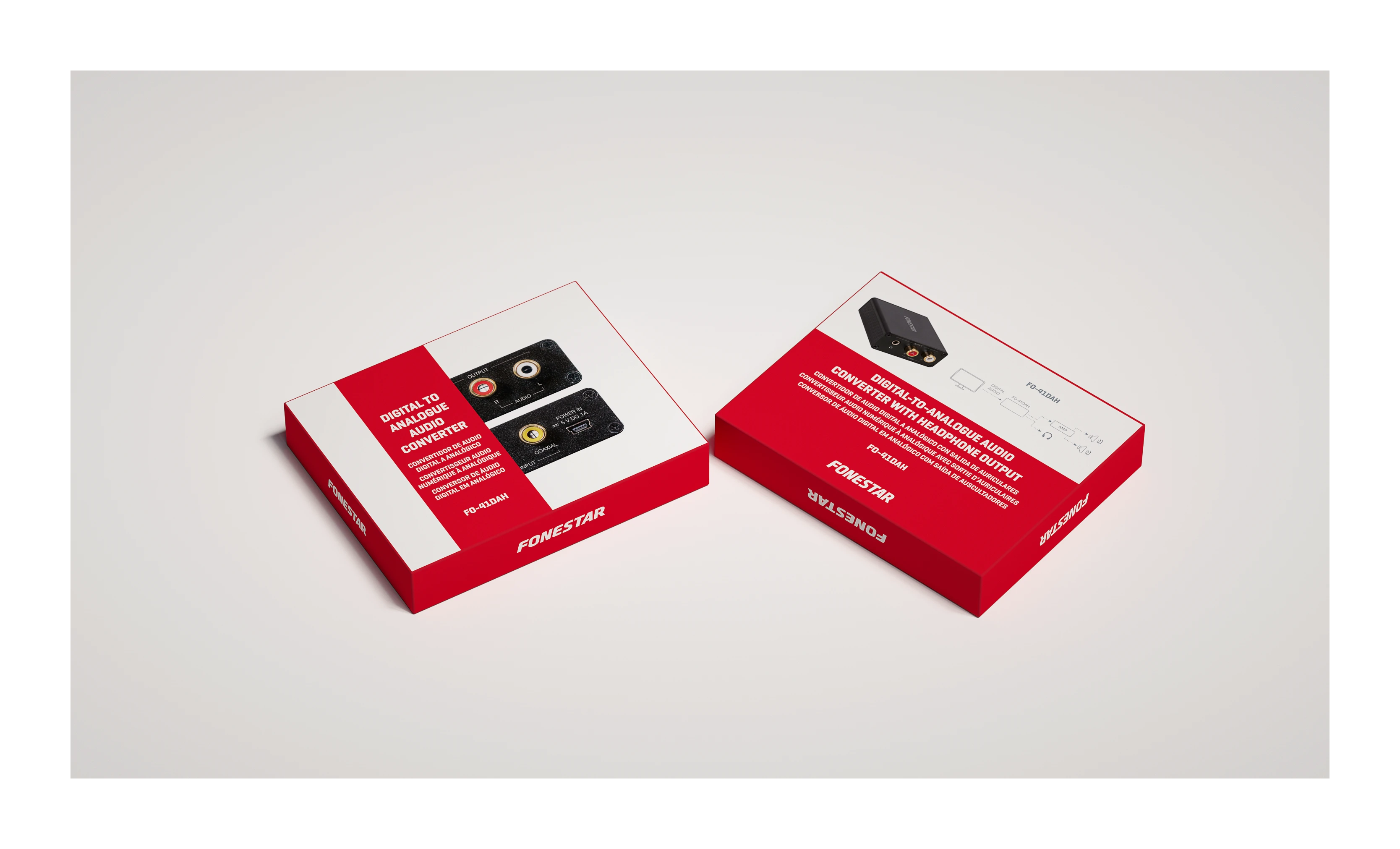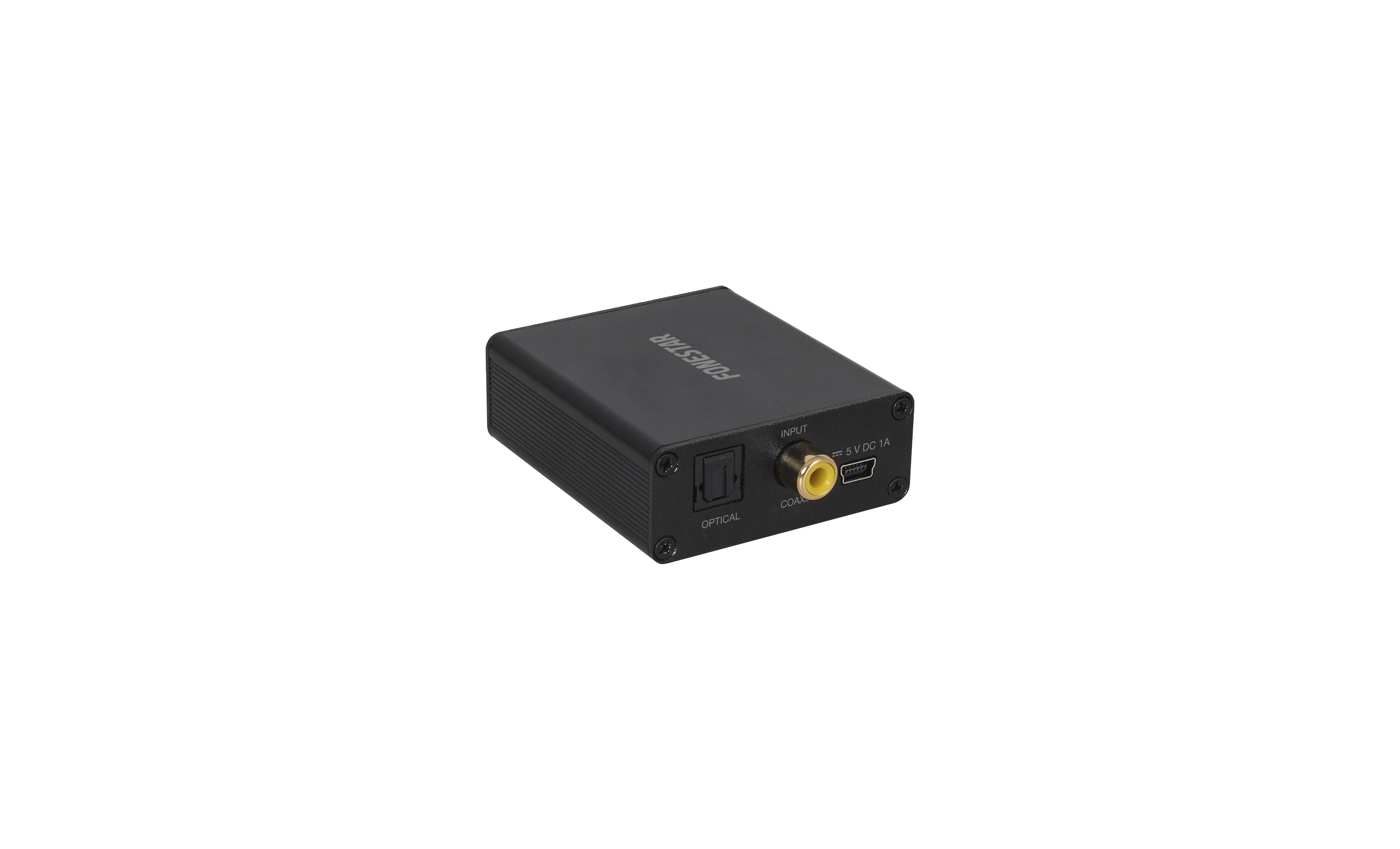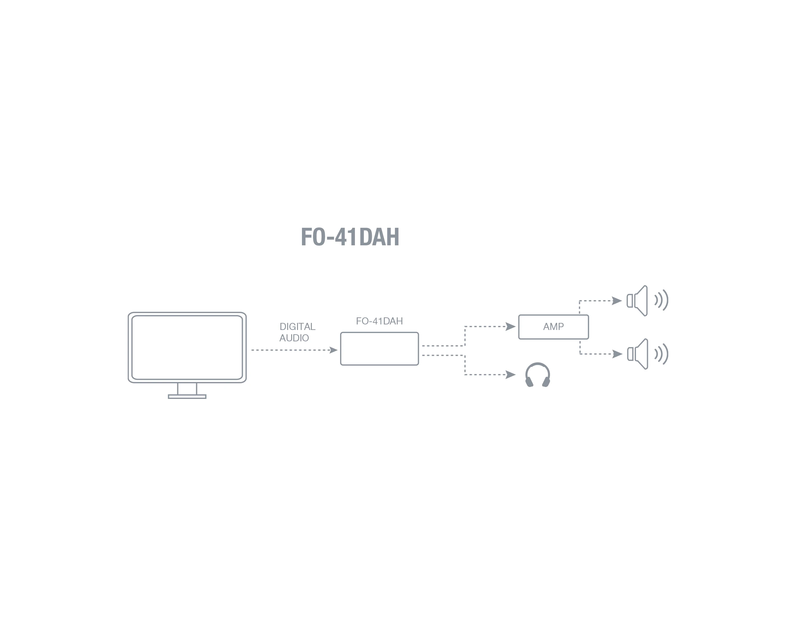 Digitálně-analogový audio převodník se sluchátkovým výstupem. Vstupy pro optický a koaxiální digitální zvuk. Malá velikost, snadná instalace a použití. Digitálně-analogový audio převodník FO-41DAH je určen pro domácí nebo profesionální audio aplikace. Převádí digitální, Toslink nebo koaxiální audio vstupní signál z TV nebo digitálního přehrávače na analogový audio signál pro připojení stereo sluchátek a externího zesilovače současně. Tento převodník má mnoho funkcí, které poskytují vysoce kvalitní zvuk. Převádí PCM digitální optický nebo SPDIF koaxiální audio vstup na stereo L/R analogové výstupy. Podporované vzorkovací frekvence zahrnují 32 kHz, 44,1 kHz, 48 kHz, 96 kHz a 192 kHz s až 24bitovým rozlišením. Vysoce věrný design s ultra nízkým kolísáním pomocí nových přijímacích čipů a D/A převodníků. Odolný hliníkový kryt. Rychlá plug and play instalace.
