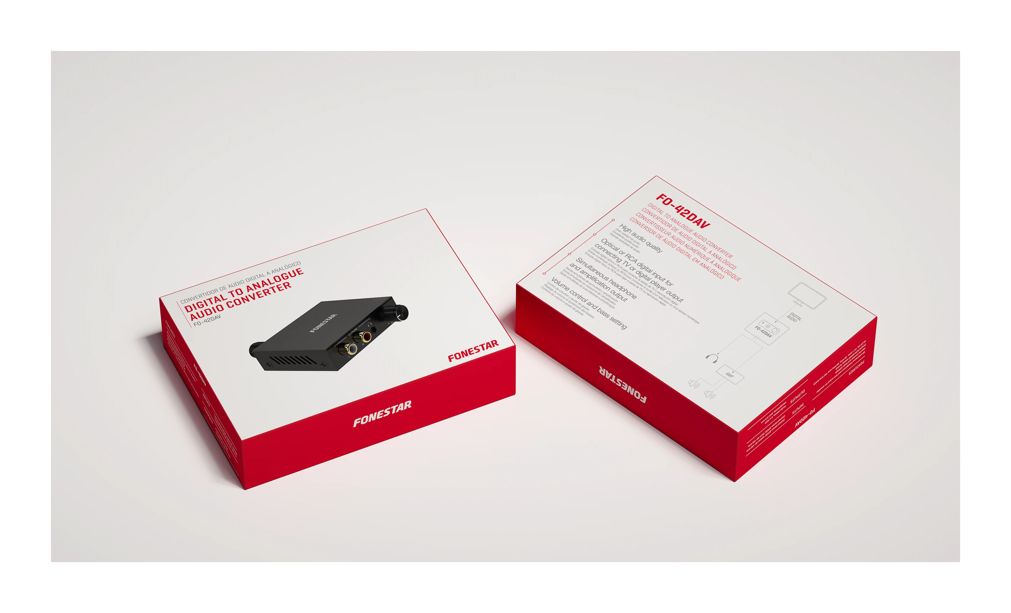 Digitálně-analogový audio převodník se sluchátkovým výstupem a ovládáním hlasitosti Digitálně-analogový audio převodník FO-42DAV převádí digitální, Toslink nebo koaxiální audio vstupní signál z TV nebo digitálního přehrávače na analogový audio signál pro připojení stereo sluchátek a externího zesilovače současně. Poskytuje vysoce kvalitní zvuk. Převádí optický nebo koaxiální digitální zvukový formát SPDIF PCM na stereofonní L/R analogové výstupy. Podporuje nejběžnější vzorkovací frekvence až do 192 kHz s až 24bitovým rozlišením. Vysoce věrný design využívající nové čipy D/A převodníku. Umožňuje ovládání basů a nastavení hlasitosti výstupu. Vysoce pevný, nerušený kovový kryt. Rychlá instalace pomocí plug and play. Pro domácí i profesionální použití.