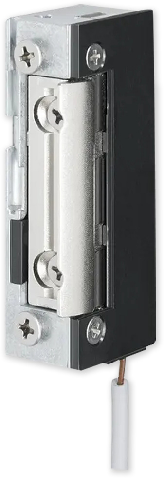 Elektromagnetický el. zámek Assa Abloy řady effeff, vhodný i do prostředí se zvýšenou vlhkostí či nebo náročným klimatem (venkovní branky, nechráněné vstupy), který propouští přes horní západku běžného zámku a montuje se do zárubní dveří. Konstrukce otvírače je vyrobena z korozi odolných materiálů, což zajišťuje dlouhou životnost otvírače i ve vlhkém prostředí.Zámek je typu přivedením napětí otevřeno.