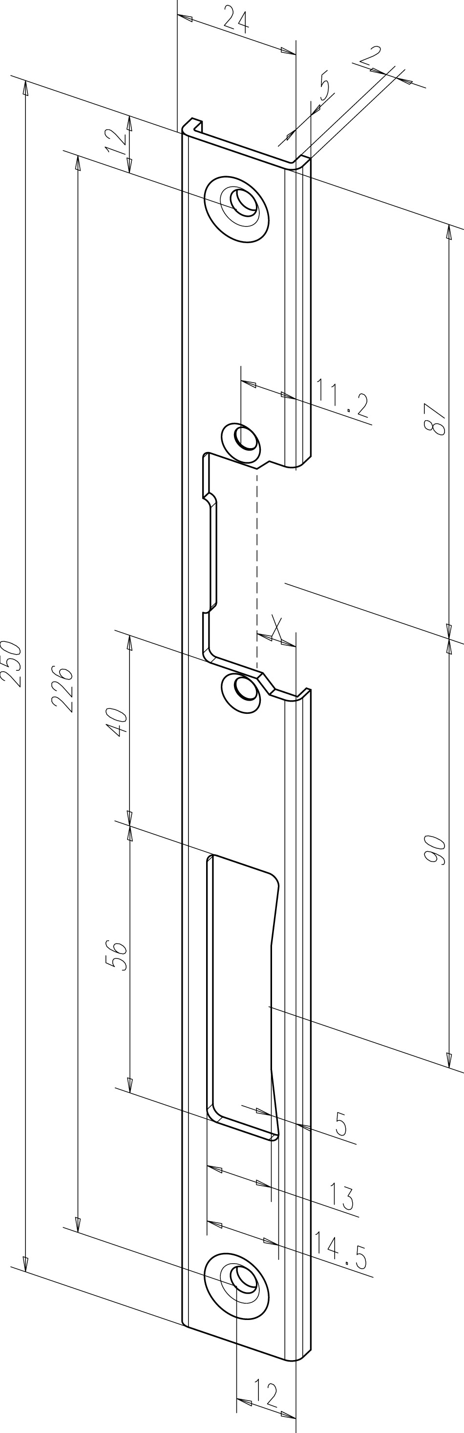Čelní plech tvaru "U" pro levé dveře, s otvorem pro závoru a výřezem pro závoru. Používá se hlavně pro zárubně plastových a hliníkových dveří. Přísluší k zámkům řady effeff.