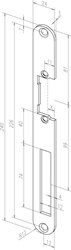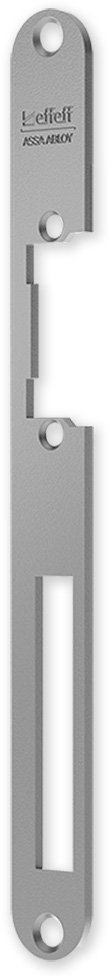 Levo/pravý čelní panel plochého profílu se zaoblenými hranami, dlouhý - s otvorem pro západku a výřezem pro závoru. Univerzální pro většinu běžných konstrukcí dveří. Přísluší k zámkům řady effeff.