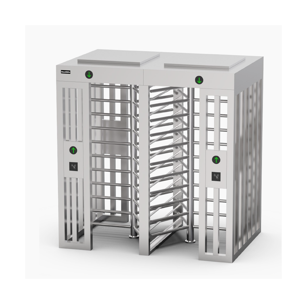 Karuselové dveře DS402FS plné výšce jsou navrženy tak, aby poskytovaly řešení kontroly přístupu pro venkovní nebo vysoce zabezpečená místa, jako jsou věznice, stadiony a staveniště. Robustní střecha s ochranou proti dešti, která odolá nepříznivému počasí, volitelně s nerezovou ocelí 304 nebo 316. Standardní velikost je 2,2 m (délka) x 1,5 m (Š), kterou lze přizpůsobit. Je ideální pro vnitřní i venkovní použití, protože celé tělo je vyrobeno z kartáčované nerezové oceli, která je vodotěsná, odolná proti korozi a tuhá. Dva viditelné LED indikátory na přední straně a další dva nahoře pro indikaci vstupu nebo odmítnutí. Obě značky zobrazují sekci. Rameno má na výběr 120° nebo 90° rotory. Má standardní vstup, který lze integrovat do jakéhokoli systému kontroly přístupu třetí strany (např. RFID, otisky prstů a biometrické čtecí zařízení).
