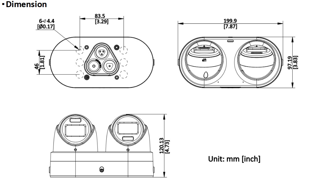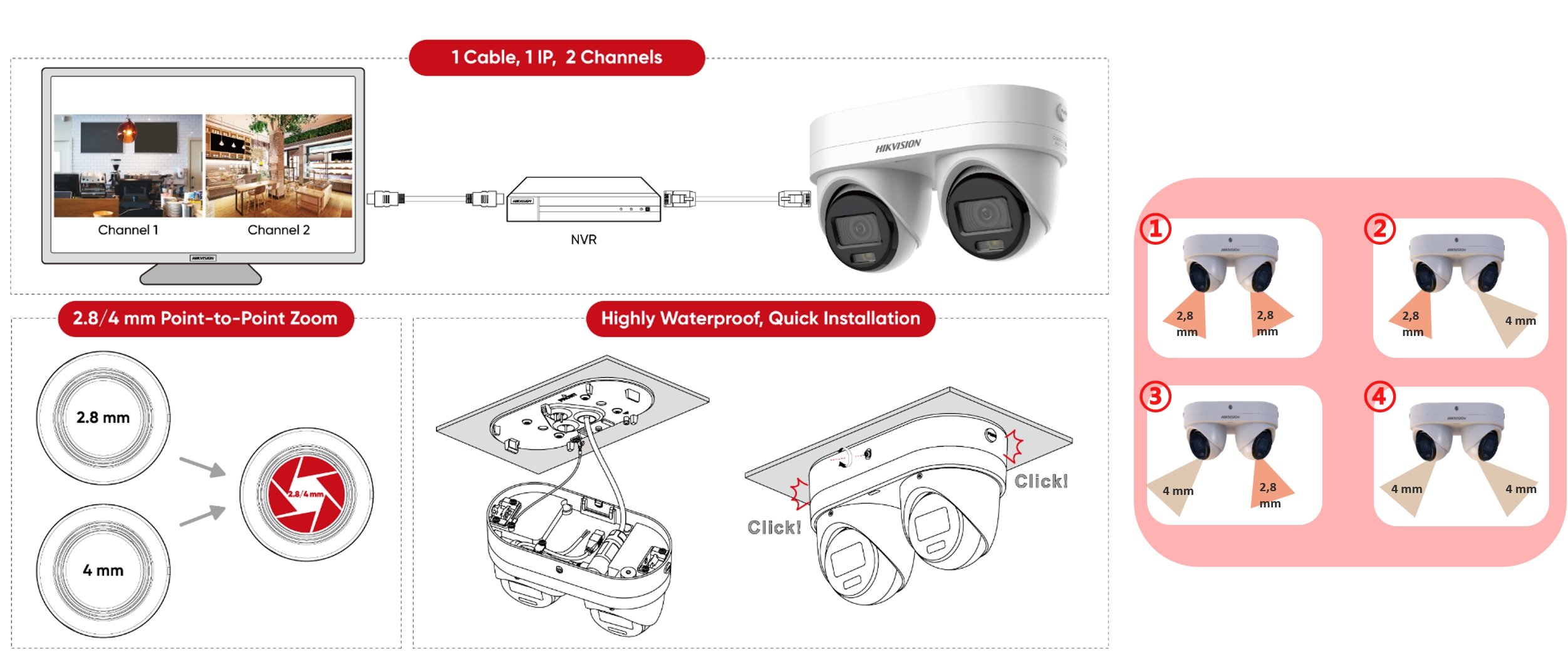 Důležité vlastnosti: 2 objektivy, které jsou na sobě nezávislé – každý lze ostřit, přibližovat (motorzoom/vzdáleně) a přidělovat mu nastavení zvlášť, 1/3" Progressive scan CMOS, rozlišení 2 x 2688 × 1520 @ 25 fps - individuálně nastavitelná šířka záběru u každého z objektivů motorické objektivy 2,8 až 4mm; dva integrované mikrofony; zorné pole - horizontální 99.3°- 80°, vertikální 52.9° - 44.1°, diagonální 120.2° - 94.0°, citlivost - Color: 0.005 Lux @ (F1.6, AGC ON), B/W: 0 Lux; hybridní přísvit do 30m, WDR: 120dB; analytické funkce, detekce: překročení čáry, narušení, zmizení objektu, zapomenutého zavazadla, rozhraní 10/100/1000 Ethernet; 1x RJ45, podporuje lokální záznam na micro SD/SDXC kartu do 512GB, napájení a spotřeba 12 VDC ± 20%, 1.42 A, max. 18 W, PoE 802.3at, stupeň krytí: IP67, IK10, NEMA 4X, provozní teploty - 40°C až +60°C, vlhkost 95%, rozměry 199.9 mm × 120.1 mm × 97.2 mm, hmotnost 1,2kg. černé provedení