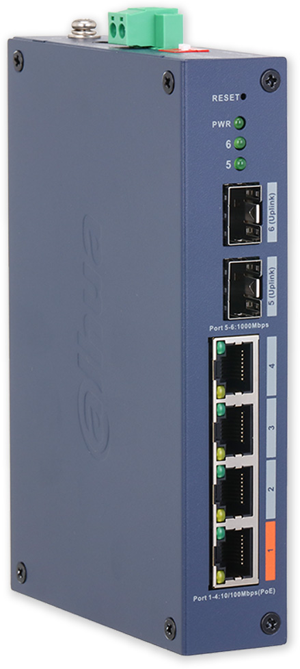 Průmyslový PoE switch, duální napájení, široký teplotní rozsah -30 až 65 °C, Cloud management L2 (DolynkCare), 4 x Gb PoE, 2 x Gb SFP uplink, celkový budget je 60 W, IEEE 802.3af; IEEE 802.3at; Hi-PoE. Přepěťové ochrany, kov, police nebo DIN, napájecí zdroj součástí balení.