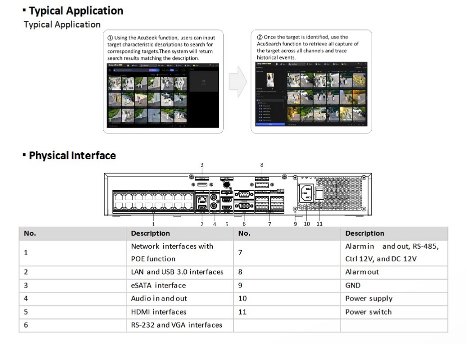 NVR s PoE pro 16 IP kamer, s integrovaným AI Guanlan, dokáže analyzovat z kamer : ANPR, rozeznání obličeje, počítaní lidí, Acuseek, Acusearch, detekce pádu, ochrana perimetru, Technologie AcuSeek: vyhledávání incidentů v záznamu pomocí slov (Kamery musí být Acusense s firmwarem V5.7.17SP a novější), Technologie Acusearch: vyhledávání incidentů v záznamu pomocí obrázku (Kamery musí být Acusense s firmwarem 5.8.0 a novější), Inteligentní analýza založená na rozsáhlých modelech umělé inteligence Guanlan,