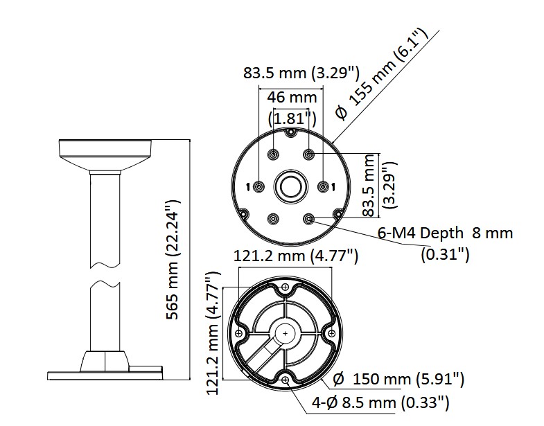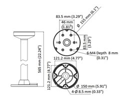 Stropní konzole pro dome kamery o průměru 155mm, odsazená, délka 565mm, hmotnost 650g, černá barva, určeno pro dome kamery série DS-2CD27x3/27x5.