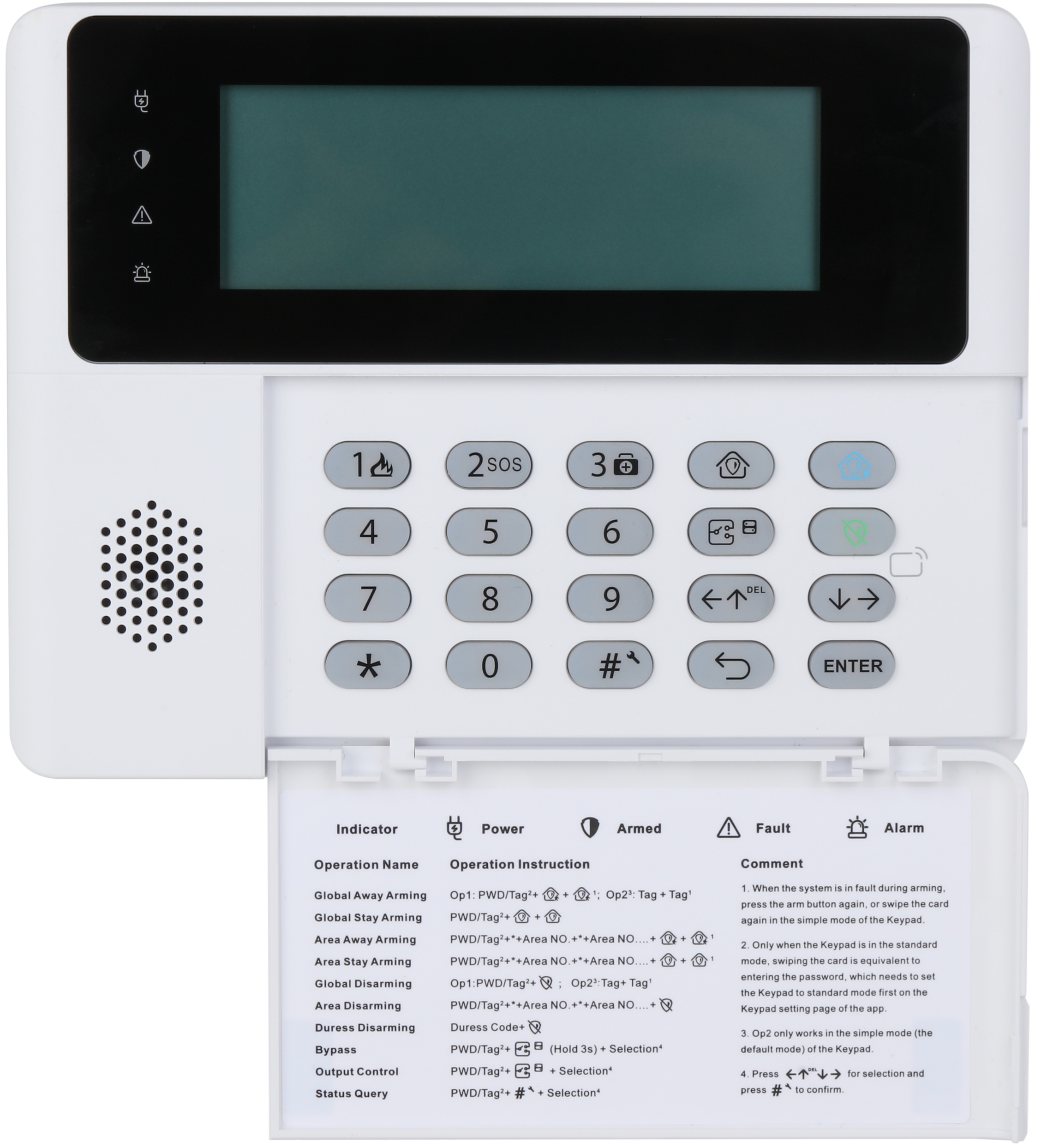 Vnitřní bezdrátová dotyková klávesnice s LCD displejem, čtečka IC karet, zvuková a LED indikace, zastřežení/odstřežení, chyba, poplach, měření teploty okolí, obousměrná komunikace 868 MHz, šifrování AES-128, dosah signálu: až 1600 m v otevřeném prostoru, tamper, vyvolání 3 přednastavených typů poplachů, napájení: 4x AA baterie (součástí balení), životnost baterií 3 roky. Český jazyk.
