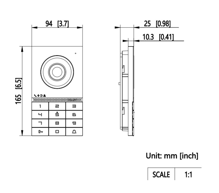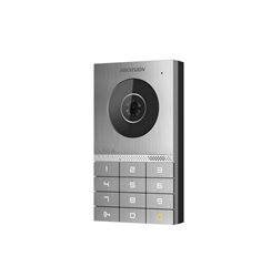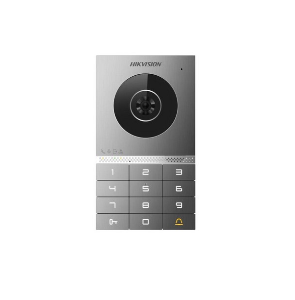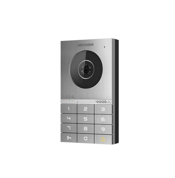 Dveřní stanice 2 drátová analog HD s klávesnicí, kovový čelní panel, podpora připojení až 16 vedlejších dveřních jednotek, základní nastavení pomocí otočných DIP přepínačů, antivandal certifikace IK8, povrchová instalace, rozlišení kamery 2Mpx (1920x1080); WDR, úhel záběru: horizontální 135° / vertikální 85°, rozhraní: 2 drátová sběrnice + WiFi(pouze pro konfiguraci v režimu AP), RFID čtečka čipů/karet Mifare (13,56MHz), klávesnice pro zadání PIN kodů a odemčení dveří, FLASH paměť 4GB, RAM 256MB, maximální počet uložených karet/čipů: 2 000, maximální počet uložených uživatelů: 2 000, 1x kontakt pro odchodové tlačítko, 1x RS485, 2x alarmový vstup, 1x tamper, 2x NO/NC kontakt pro zámek, pro napájení zámku doporučujeme použít externí napájecí zdroj, napájení 48 VDC z distributoru DS-KAD7060EY, příkon 6W, IP65, IK08, provozní teplota -40°C až +60°C, rozměry 165 × 95 × 25 mm.