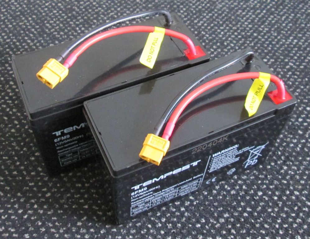 2 akumulátory pro BAT 300 - FOG. Olověné akumulátory 12V, 9Ah zakončené konektory.