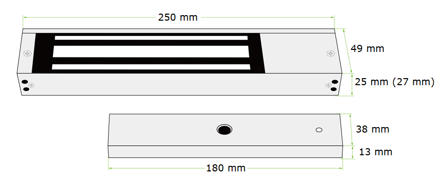 Elektrický přídržný magnet. Pro uzamčení dveří musí být trvale připojeno napájecí napětí. Obsahuje spínací elektroniku s LED indikací. Dodává se s ocelovým protikusem a montážním příslušenstvím.